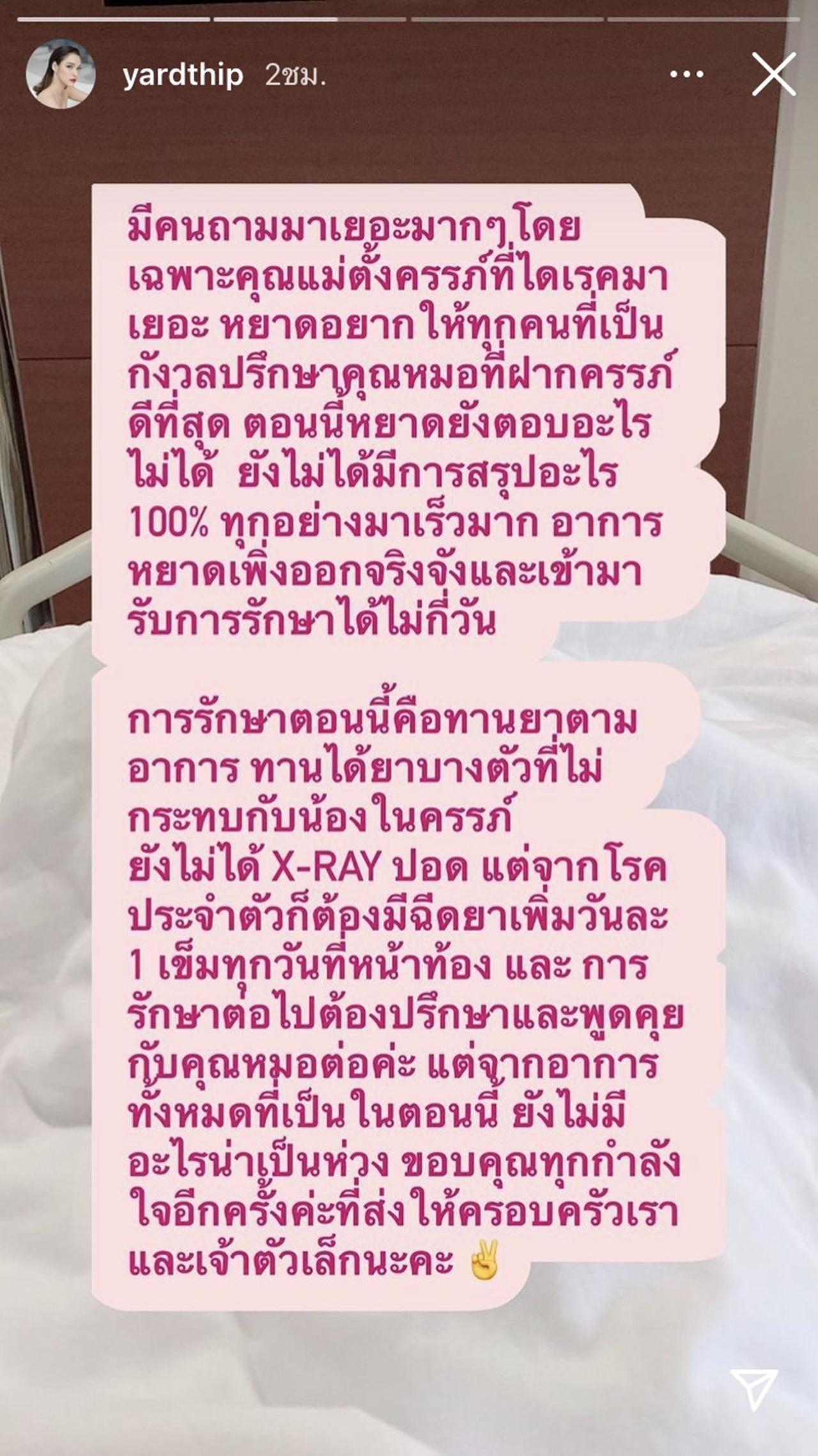 นอกจากนี้ หยาดทิพย์ ก็ได้โพสต์ไอจีสตอรี่ถึงการเข้ารับการรักษาตัวในวันที่ 2 โดยบอกว่า ตอนนี้หลายคนมาถามเยอะมากเกี่ยวกับคุณแม่ตั้งครรภ์ที่ป่วยโควิด-19 อยากให้ปรึกษาหมอที่ฝากครรภ์โดยตรงดีกว่า เพราะตนเองยังตอบอะไรไม่ได้เช่นกัน ทุกอย่างเกิดขึ้นเร็วมาก