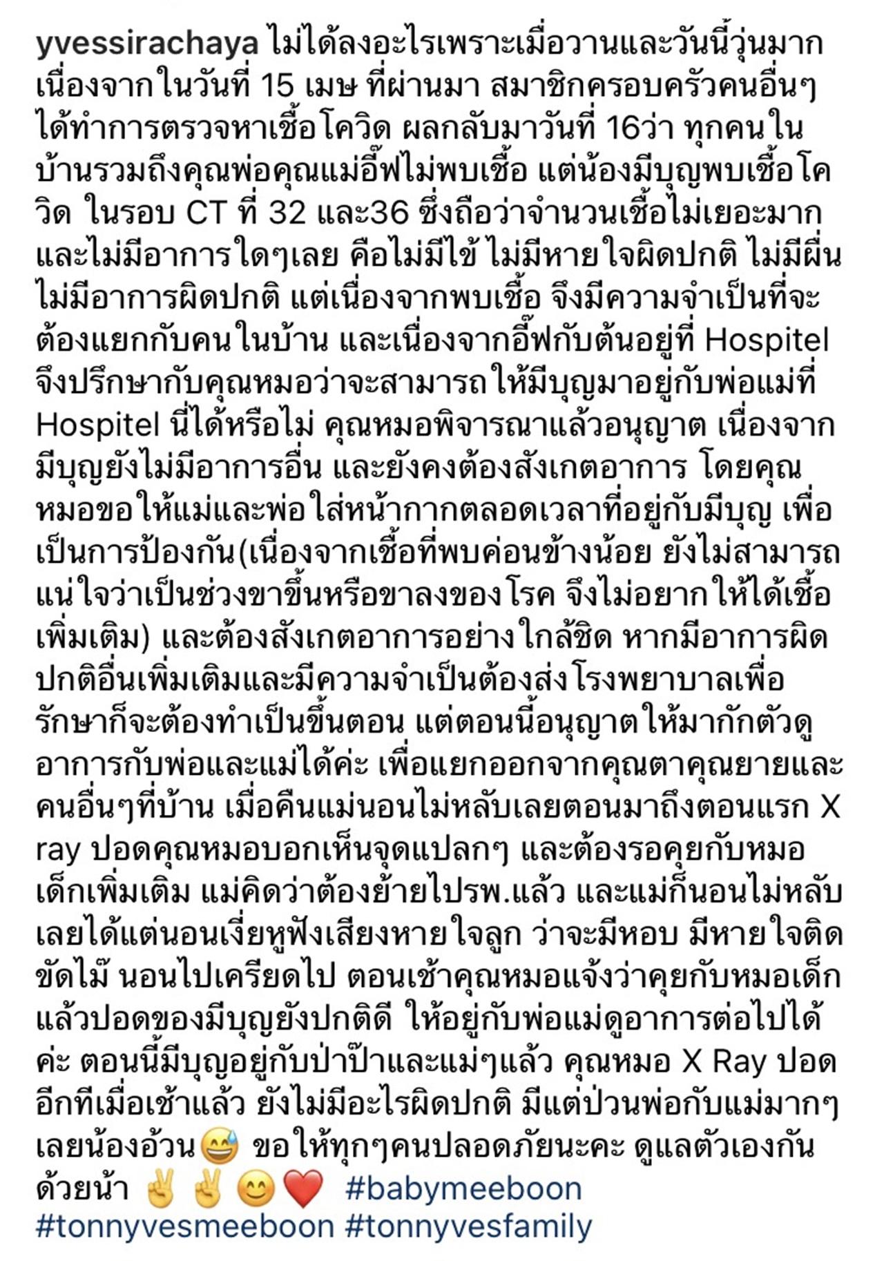 "ไม่ได้ลงอะไรเพราะเมื่อวานและวันนี้วุ่นมาก เนื่องจากในวันที่ 15 เมษ ที่ผ่านมา สมาชิกครอบครัวคนอื่นๆได้ทำการตรวจหาเชื้อโควิด ผลกลับมาวันที่ 16 ว่า ทุกคนในบ้านรวมถึงคุณพ่อคุณแม่อี๊ฟไม่พบเชื้อ แต่น้องมีบุญพบเชื้อโควิด ในรอบ CT ที่ 32 และ36 ซึ่งถือว่าจำนวนเชื้อไม่เยอะมาก และไม่มีอาการใดๆเลย
