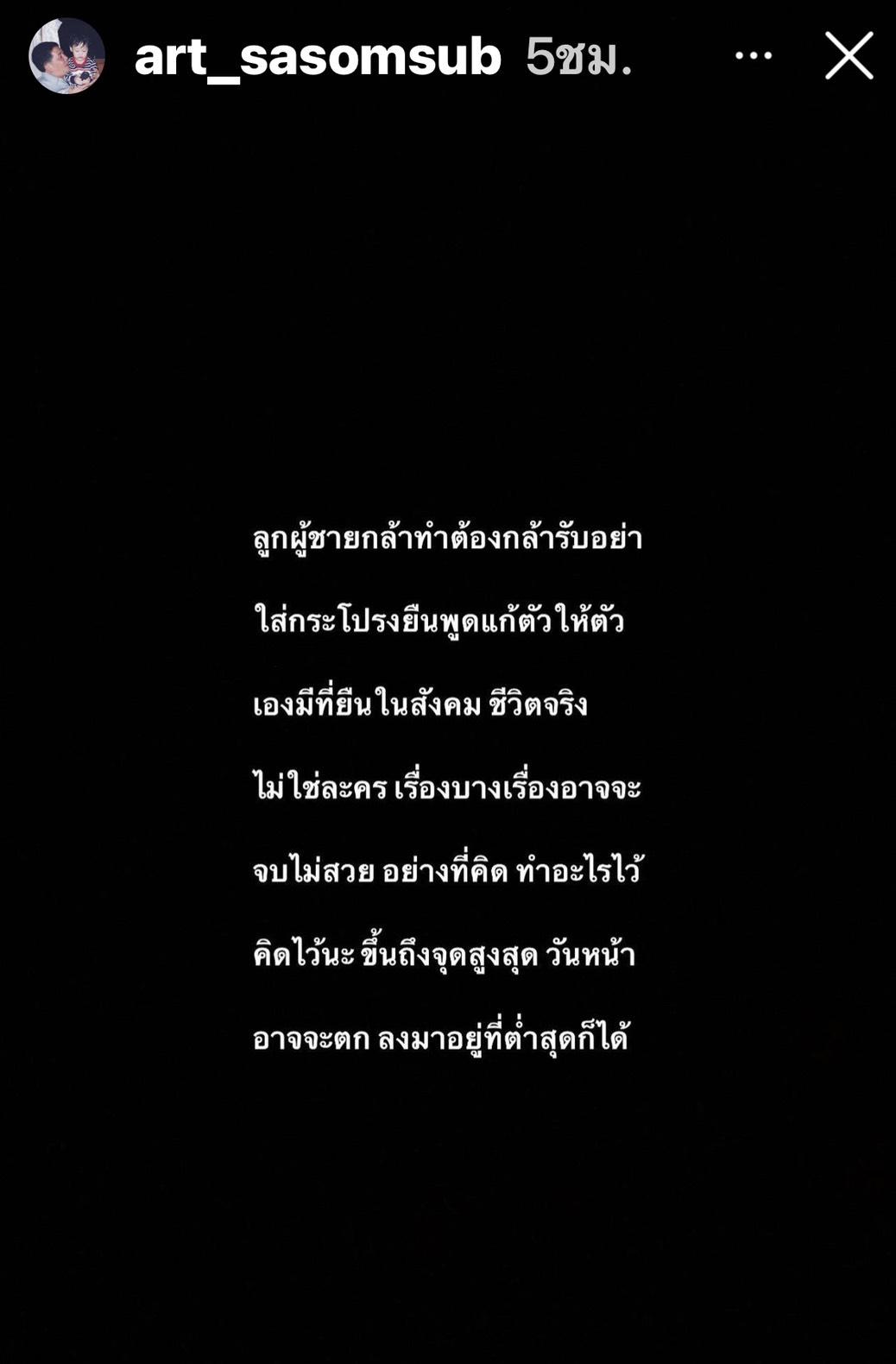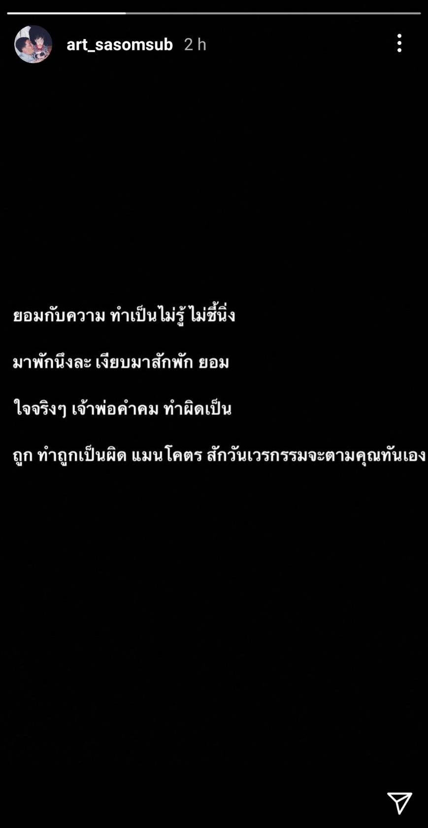 “ลูกผู้ชายกล้าทำต้องกล้ารับ อย่าใส่กระโปรงยืนพูดแก้ตัวให้ตัวเองมีที่ยืนในสังคม ชีวิตจริงไม่ใช่ละคร เรื่องบางเรื่องอาจจะจบไม่สวยอย่างที่คิด ทำอะไรไว้คิดไว้นะ ขึ้นถึงจุดสูงสุด วันหน้าอาจจะตกลงมาอยู่ที่ต่ำสุดก็ได้ เป็นลูกผู้ชายหน่อยเลิกแก้ตัว และมายอมรับความผิดแบบแมนๆ เพื่อจะได้มีที่ยืนในสังคมเหลือบ้าง ยอมกับความทำเป็นไม่รู้ไม่ชี้ นิ่งมาพักนึงละ เงียบมาสักพัก ยอมใจจริงๆ เจ้าพ่อคำคม ทำผิดเป็นถูก ทำถูกเป็นผิด แมนโคตร สักวันเวรกรรมจะตามคุณทันเอง”.