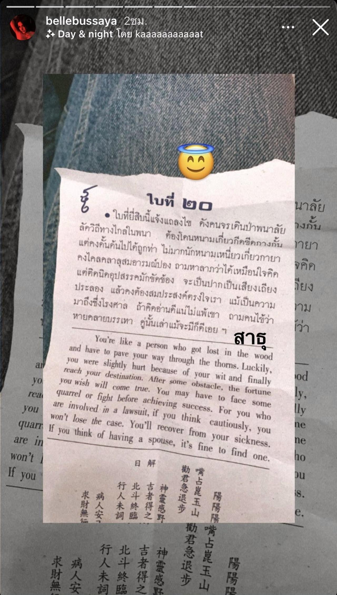 และนอกจากนี้ เบล บุษยา ยังลงใบเซียมซีที่ในใบนั้นเขียนคำทำนายเอาไว้ว่า "แม้เป็นความมาถึงซึ่งโรงศาล ถ้าคิดอ่านดีแน่ไม่แพ้เขา" อีกด้วย