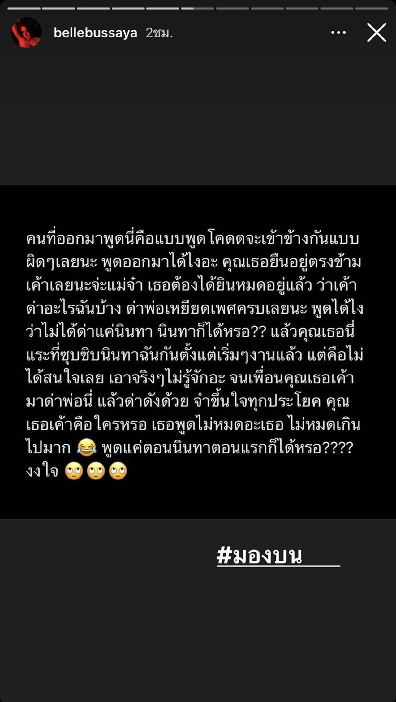 และนอกจากนี้ เบล บุษยา ยังโพสต์ภาพข้อความที่ว่า "คนที่ออกมาพูดนี่คือแบบพูดโคดตจะเข้าข้างกันแบบ