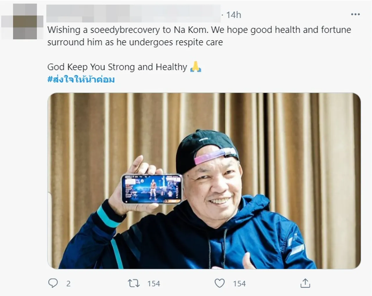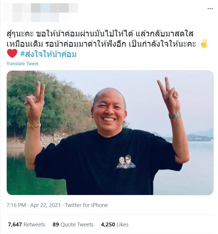 โดยในโลกทวิตเตอร์มีการโพสต์ภาพของน้าค่อม พร้อมทั้งติดแฮชแท็ก #ส่งใจให้น้าค่อม และเขียนข้อความส่งกำลังใจและอวยพรให้หายป่วยไวๆ จนติดเทรนด์ทวิตเตอร์ในเวลาอันรวดเร็ว นอกจากนี้ยังมีชาวโซเชียลที่พยายามติดต่อ เอม วิทวัส รัตนบุญบารมี เน็ตไอดอล-พิธีกรชื่อดัง ผ่านทางไดเร็กไอจี เพื่อให้เบอร์ติดต่อของ รพ.ศิริราช ซึ่งมีทีมรักษาอาการป่วยของผู้ว่าฯ จ.สมุทรสาคร โดยให้ รพ. ต้นทางที่รักษาติดต่อเพื่อรีเฟอร์คนไข้ให้มารักษาต่อ รพ.ศิริราช และเอมก็ได้แชร์โพสต์ดังกล่าวลงไอจีสตอรี่