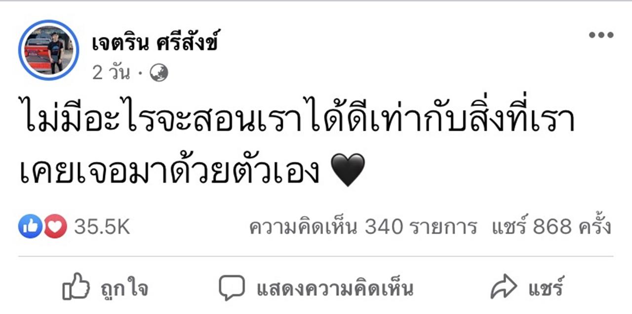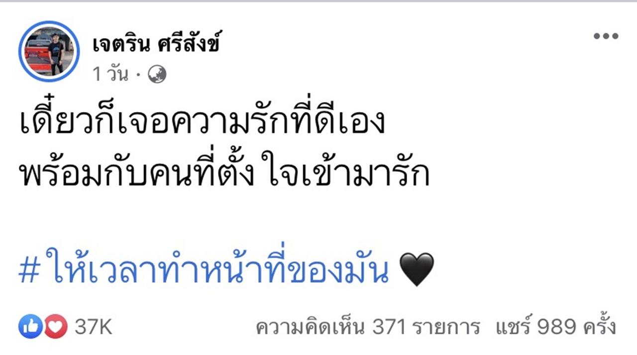 ซึ่งหลังจากที่ เจนนี่ ได้หมดถ้าสดชื่น ได้เคลียร์ชัดเรื่องดังกล่าวไป ทางด้านอดีตคนรักอย่าง เนเงิน เจตริน ศรีสังข์ ก็ได้โพสต์ข้อความผ่านเฟซบุ๊กรัวๆ มากมาย อาทิ "ชีวิตไม่ได้อยู่ที่เดินทางมาไกลแค่ไหน แต่อยู่ที่ผ่านอะไรมาบ้างในระหว่างทาง, เดี๋ยวก็เจอความรักที่ดีเอง พร้อมกับคนที่ตั้งใจเข้ามารัก #ให้เวลาทำหน้าที่ของมัน, คนที่หายากที่สุดในชีวิต คือคนที่เข้าใจ, ไม่มีอะไรจะสอนเราได้ดีเท่ากับสิ่งที่เราเคยเจอมาด้วยตัวเอง"