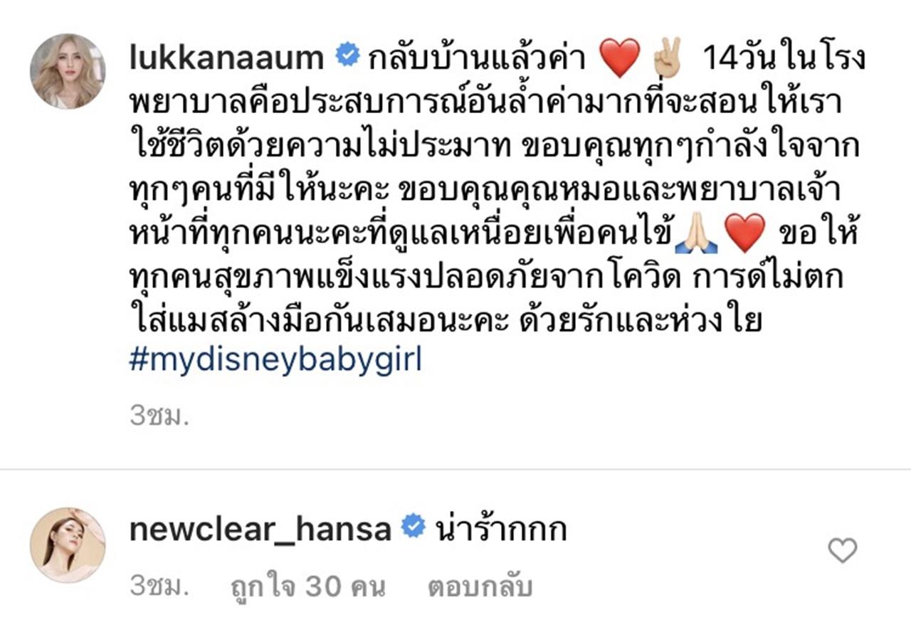 โดย อุ้ม ได้เผยภาพครอบครัวพร้อมหน้าพ่อแม่ลูก ที่กำลังจุ๊บหน้าผากกันอย่างมีความสุข พร้อมเขียนบอกเล่าว่า "กลับบ้านแล้วค่า 14 วันในโรงพยาบาลคือประสบการณ์อันล้ำค่ามากที่จะสอนให้เราใช้ชีวิตด้วยความไม่ประมาท