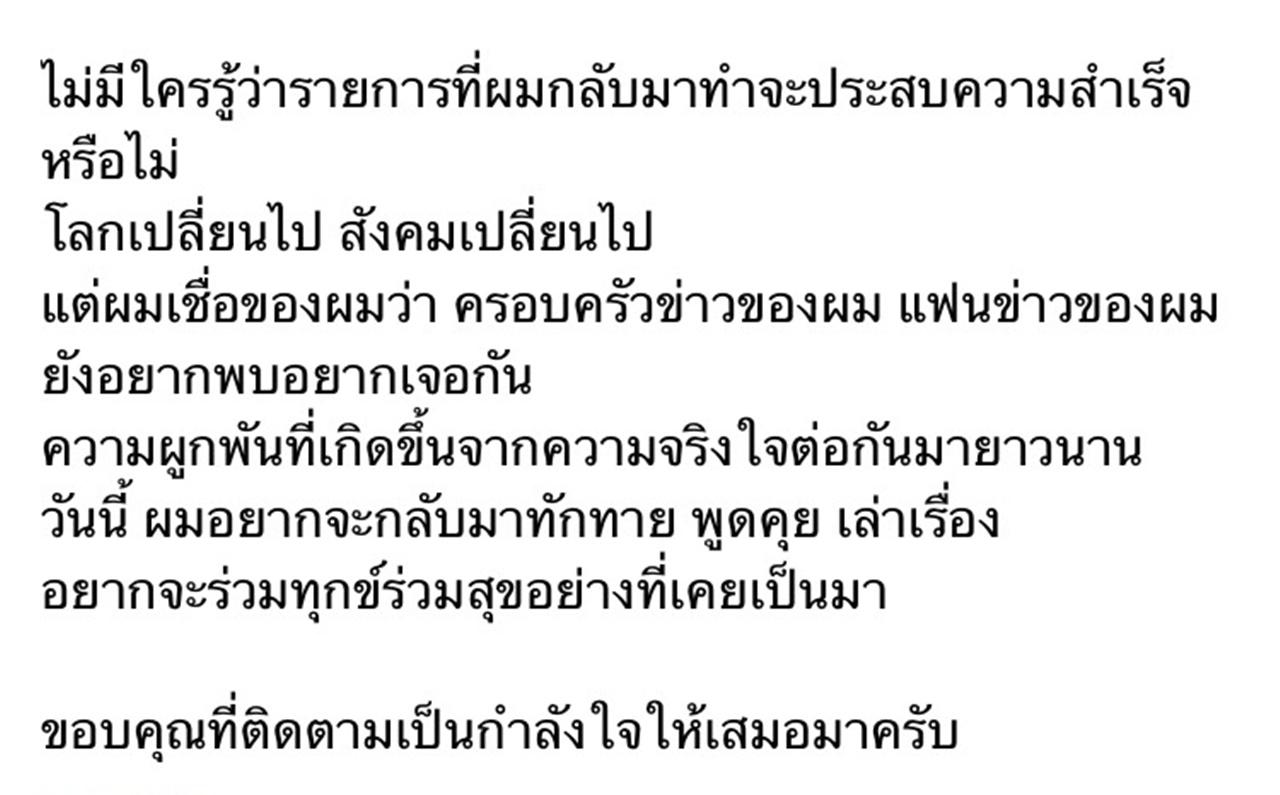 วันนี้ ผมอยากจะกลับมาทักทาย พูดคุย เล่าเรื่อง อยากจะร่วมทุกข์ร่วมสุขอย่างที่เคยเป็นมา ขอบคุณที่ติดตามเป็นกำลังใจให้เสมอมาครับ".