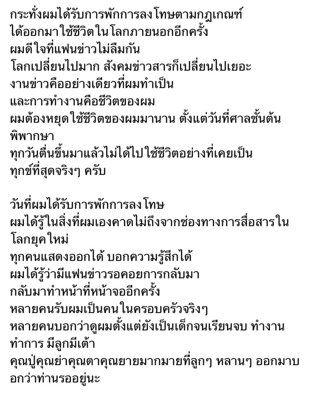 ผมดีใจที่แฟนข่าวไม่ลืมกัน โลกเปลี่ยนไปมาก สังคมข่าวสารก็เปลี่ยนไปเยอะ งานข่าวคืออย่างเดียวที่ผมทำเป็น และการทำงานคือชีวิตของผม ผมต้องหยุดใช้ชีวิตของผมมานาน ตั้งแต่วันที่ศาลชั้นต้นพิพากษา ทุกวันตื่นขึ้นมาแล้วไม่ได้ไปใช้ชีวิตอย่างที่เคยเป็น ทุกข์ที่สุดจริงๆ ครับ
