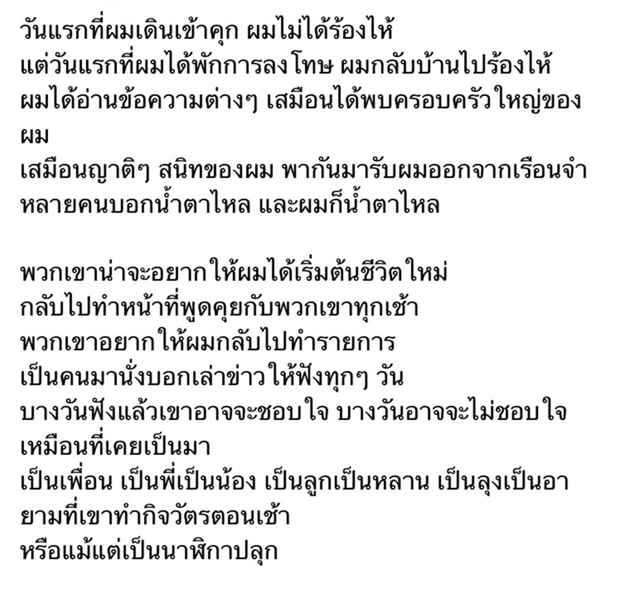 หลายคนบอกน้ำตาไหล และผมก็น้ำตาไหล พวกเขาน่าจะอยากให้ผมได้เริ่มต้นชีวิตใหม่ กลับไปทำหน้าที่พูดคุยกับพวกเขาทุกเช้า พวกเขาอยากให้ผมกลับไปทำรายการ เป็นคนมานั่งบอกเล่าข่าวให้ฟังทุกๆ วัน บางวันฟังแล้วเขาอาจจะชอบใจ บางวันอาจจะไม่ชอบใจ เหมือนที่เคยเป็นมา เป็นเพื่อน เป็นพี่เป็นน้อง เป็นลูกเป็นหลาน เป็นลุงเป็นอา ยามที่เขาทำกิจวัตรตอนเช้า