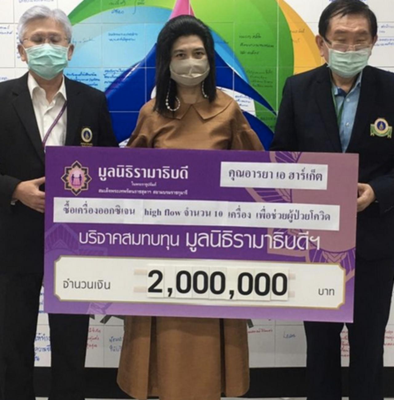 ชื่นชมกันเยอะ ชมพู่ อารยา เอ ฮาร์เก็ต บริจาคเงิน 2,000,000 บาท และ สิริธร กรีวงษ์ ให้เงิน 200,000 บาท เพื่อสมทบทุนมูลนิธิรามาธิบดีฯ โครงการป้องกันและช่วยเหลือสถานการณ์ แพร่ระบาดโควิด-19 ไปซื้อเครื่องออกซิเจน high flow 11 เครื่อง รับมอบโดย รศ.นพ.สุรศักดิ์ ลีลาอุดมลิปิ ผู้อำนวยการโรงพยาบาลรามาธิบดี, ศ.เกียรติคุณ นพ.พรชัย สิมะโรจน์ อาจารย์ประจำคณะแพทยศาสตร์ โรงพยาบาลรามาธิบดี สำนักงานผู้อำนวยการ ชั้น 2 อาคารบริหาร