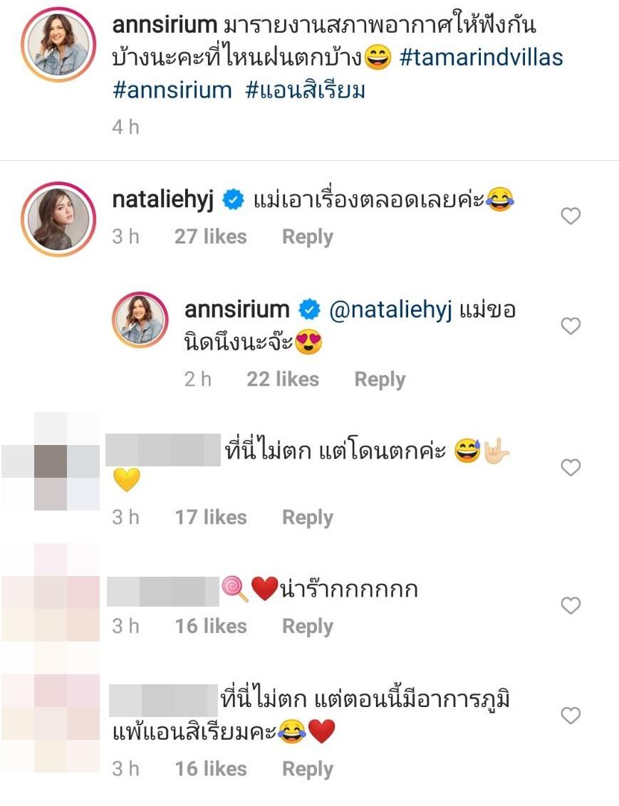 เรียกว่าเป็นคุณแม่ที่แซ่บจริงๆ เพราะหลังจากนั้นไอจีของแอน สิเรียม ก็เต็มไปด้วยคอมเมนต์จากแฟนๆ ที่ต่างบอกว่าอากาศร้อนมาก ไฟลุกไม่แผ่ว สวยมาก พร้อมทั้งปาอีโมจิหัวใจและไฟลุกเต็มไอจี ด้านนักแสดงสาว นาตาลี ปณาลี ก็ได้คอมเมนต์ว่า “แม่เอาเรื่องตลอดเลยค่ะ” และแอนตอบกลับว่า “แม่ขอนิดนึงนะจ๊ะ”.