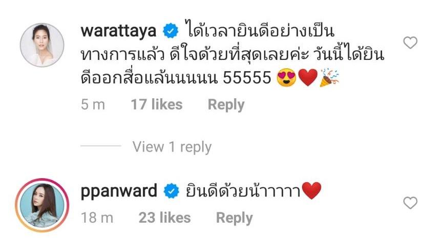 ด้านคนในวงการบันเทิงก็เข้ามาแสดงความยินดีมากมาย รวมไปถึงว่าที่คุณแม่อย่างนางเอกสาว มิว นิษฐา จิรยั่งยืน ก็ได้โพสต์ข้อความว่า “Hehehe Congratulations again na kaaaa” อีกทั้งยังมี จุ๋ย วรัทยา นิลคูหา เข้ามาคอมเมนต์ว่า "ได้เวลายินดีอย่างเป็นทางการแล้ว ดีใจด้วยที่สุดเลยค่ะ วันนี้ได้ยินดีออกสื่อแล้นนนนน 55555" ด้วย.