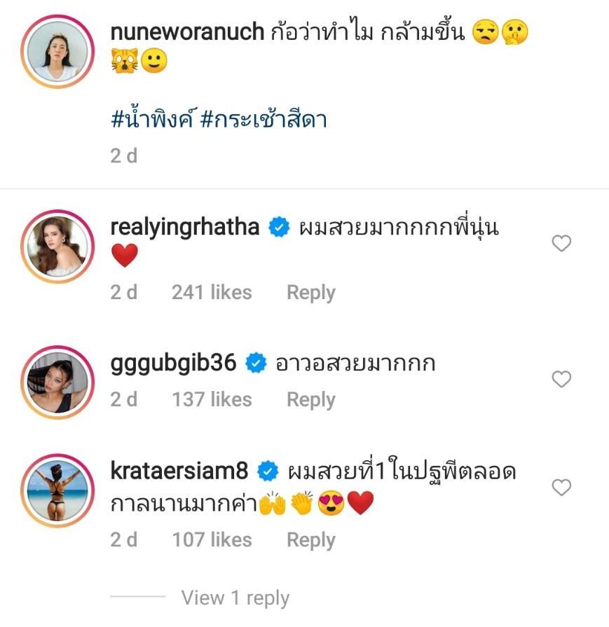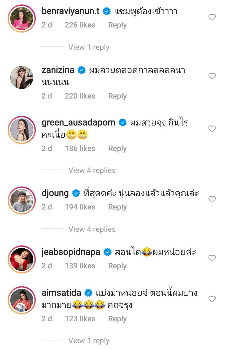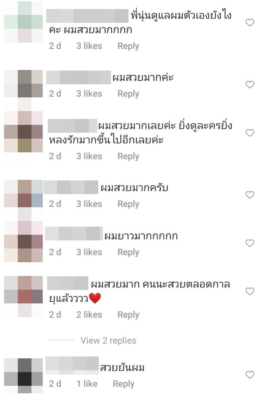 งานนี้เลยมีคอมเมนต์ทั้งจากแฟนๆ รวมถึงคนในวงการบันเทิงที่ต่างพูดเป็นเสียงเดียวกันว่าผมสวยมาก อีกทั้งยังแซวว่างานโฆษณายาสระผมต้องเข้าแล้ว และมีหลายคนคอมเมนต์ขอเคล็ดลับการดูแลผมอีกด้วย.