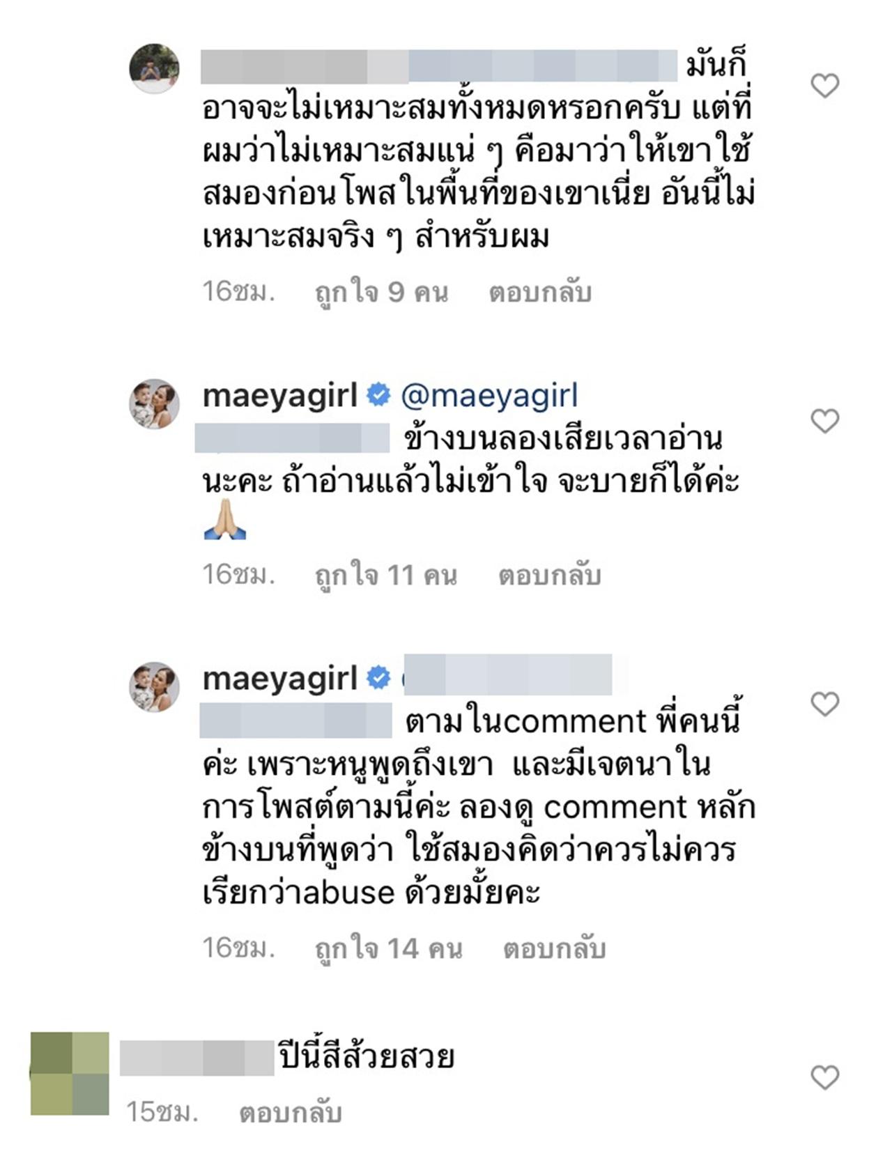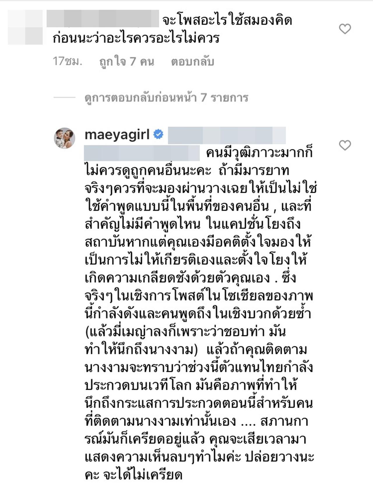 ซึ่งงานนี้กลายเป็นดราม่า มีคนเข้ามาต่อว่าหลายคน โดยบอกว่า จะโพสต์อะไรควรใช้สมองคิดก่อนว่าอะไรควรไม่ควร และ เมญ่า ก็ได้เขียนชี้แจงว่า