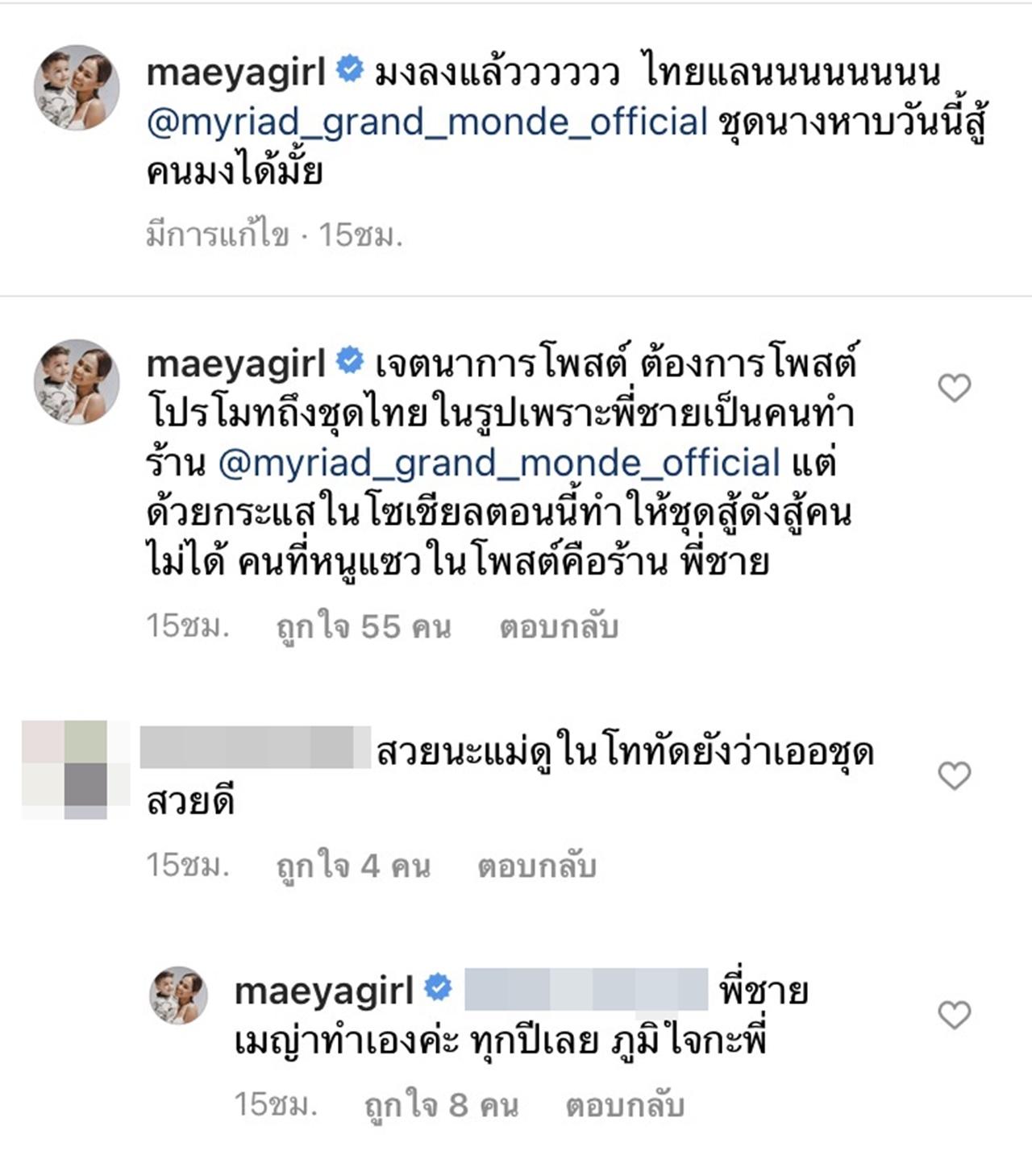 "เจตนาการโพสต์ ต้องการโพสต์โปรโมตถึงชุดไทยในรูปเพราะพี่ชายเป็นคนทำ ร้าน @myriad_grand_monde_official แต่ด้วยกระแสในโซเชียลตอนนี้ทำให้ชุดดังสู้คนไม่ได้ คนที่หนูแซวในโพสต์คือร้าน พี่ชาย"