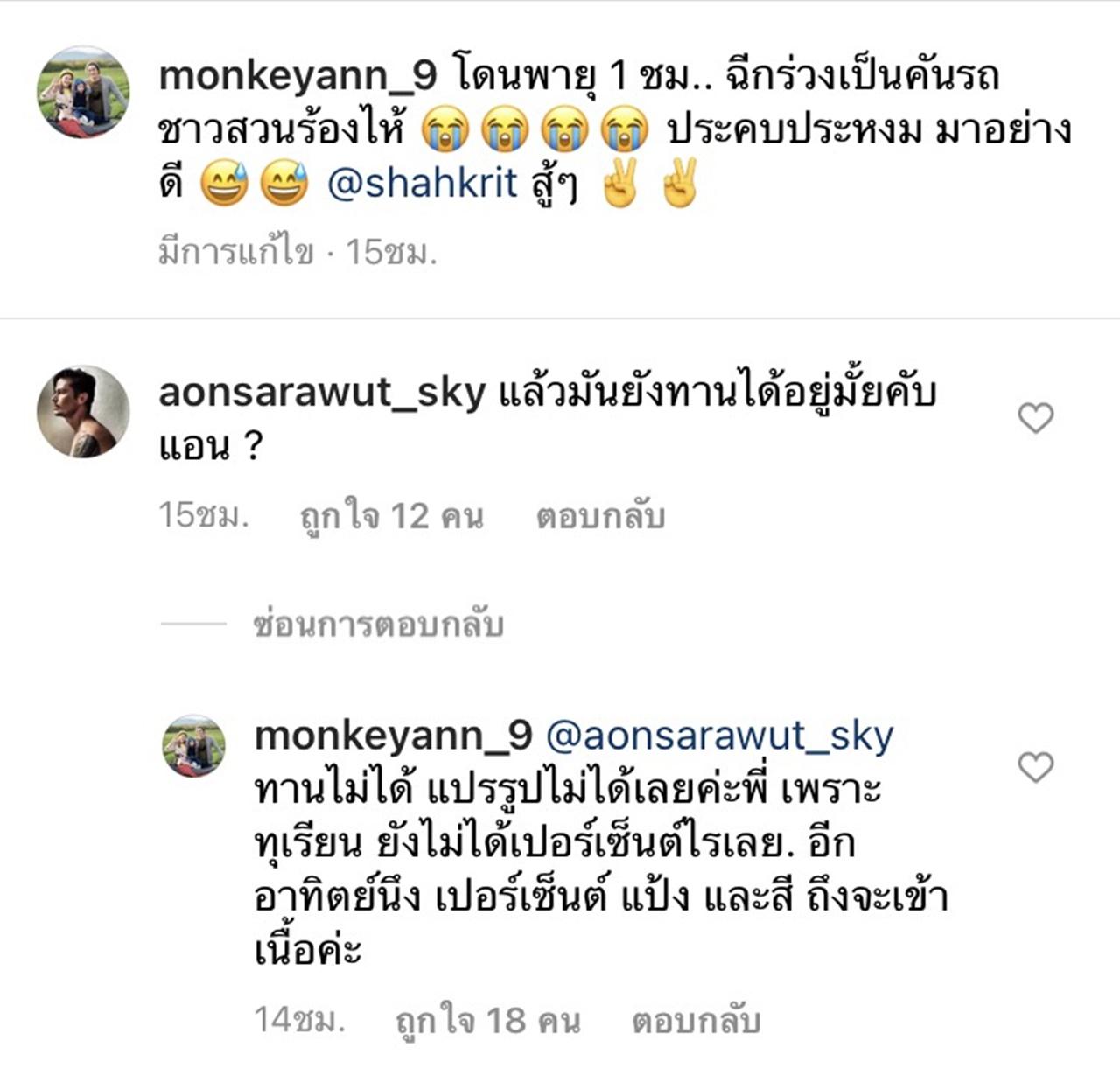 ด้าน อ้น สราวุธ ก็ได้เข้ามาคอมเมนต์ถามว่า แล้วทุเรียนที่ร่วงนี้มันยังทานได้หรือไม่ ถ้ามีอะไรให้ช่วยก็บอกได้นะ ซึ่ง แอน ก็ตอบว่า ทานไม่ได้ แปรรูปอะไรไม่ได้เลย