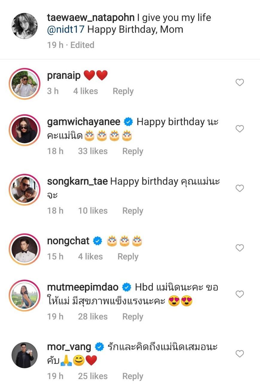โดยมีคนในวงการบันเทิงตลอดจนแฟนๆ เข้ามาคอมเมนต์อวยพรวันเกิดคุณแม่ของแต้วเป็นจำนวนมาก และต่างชมว่าเป็นครอบครัวที่อบอุ่น ด้านไฮโซณัยก็ได้คอมเมนต์เป็นอีโมจิรูปหัวใจด้วย.