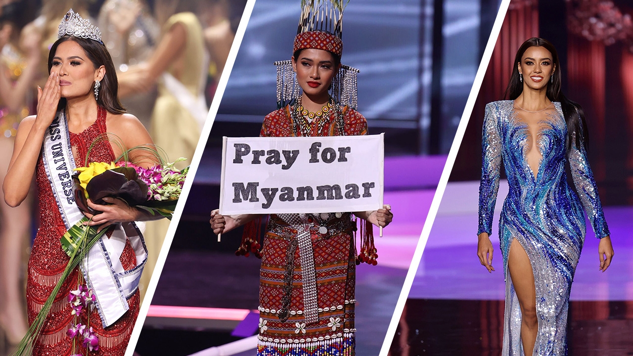 อันเดรีย เมซา (ซ้าย) สาวงามเม็กซิโก คว้ามงกุฎ มิสยูนิเวิร์ส 2020 ส่วนอแมนด้า ออบดัม (กลาง) ผ่านเข้ารอบ 10 คนสุดท้าย โดยมีกำลังใจจากชาวไทย ล้นหลาม ด้าน “ตูซาร์ วินต์ ลวิน” จากเมียนมา คว้าชุดประจำชาติ.