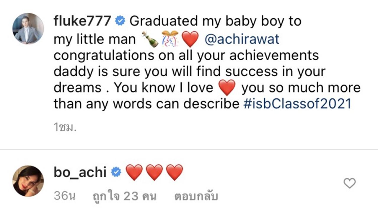 ตอนนี้ น้องอชิ โตเป็นหนุ่มแล้ว ซึ่งนำความภาคภูมิใจมาให้กับ พ่อฟลุค แม่โบ อย่างมาก และล่าสุดก็ได้เรียนจบ ม.6 อย่างเป็นทางการแล้ว โดย แม่โบ ก็ได้โพสต์ภาพในวันที่ลูกชายเรียนจบ พร้อมเขียนแคปชั่นร่วมยินดีกับความสำเร็จอีกขั้นของลูกชาย