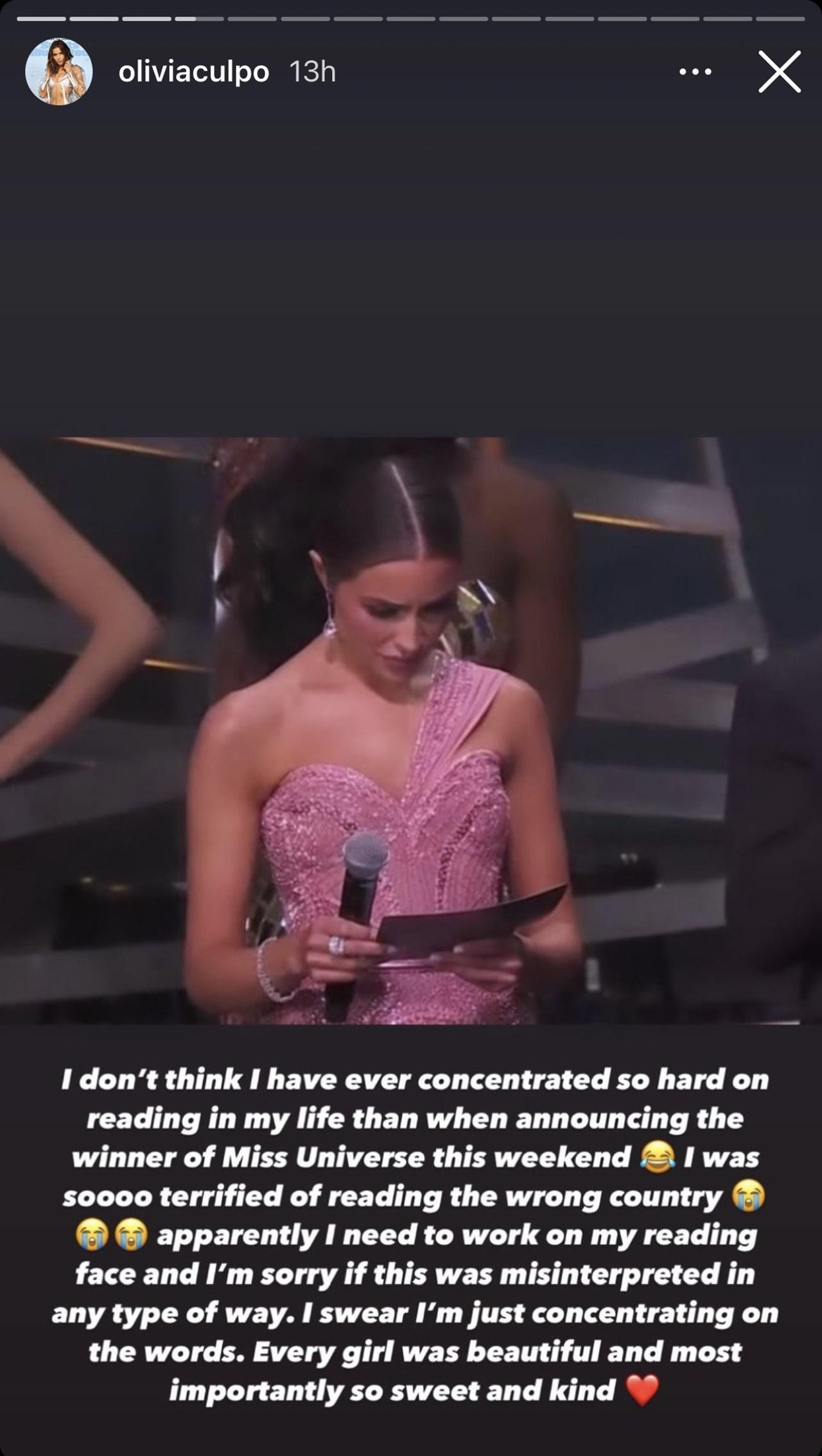 แต่หลังจากที่มีประเด็นดังกล่าวออกมาไม่นาน โอลิเวีย คัลโป ก็ได้ออกมาชี้แจงถึงเรื่องนี้ผ่านไอจีสตอรี่เป็นภาษาอังกฤษ ซึ่งแปลได้ว่า