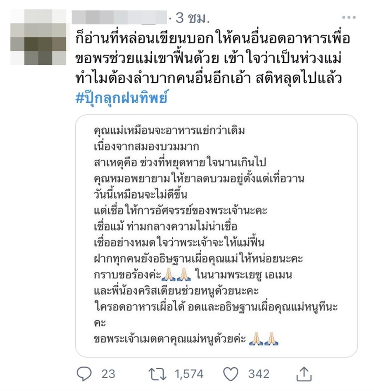 ต่อมา ปุ๊กลุก ก็ได้อัปเดตอาการคุณแม่เรื่อยๆ และฝากให้ทุกคนอธิษฐานเผื่อคุณแม่ให้หน่อย กราบขอร้อง ในนามพระเยซู เอเมน และพี่น้องคริสเตียนให้ช่วย ใครอดอาหารเผื่อได้ อดและอธิษฐานเผื่อคุณแม่ที จากนั้นก็ได้โพสต์คลิปผ่านไอจีสตอรี่ที่ยืนเฝ้าข้างเตียงคุณแม่ไม่ไปไหน และคอยร้องเพลงนมัสการ อธิษฐานให้คุณแม่ปลอดภัย