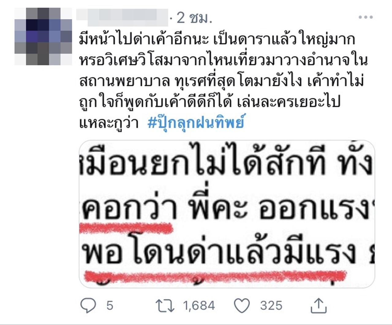 - มีหน้าไปด่าเค้าอีกนะ เป็นดาราแล้วใหญ่มากหรอวิเศษวิโสมาจากไหนเที่ยวมาวางอำนาจในสถานพยาบาล ทุเรศที่สุดโตมายังไง เค้าทำไม่ถูกใจก็พูดกับเค้าดีๆ ก็ได้ เล่นละครเยอะไปแหละกูว่า #ปุ๊กลุกฝนทิพย์