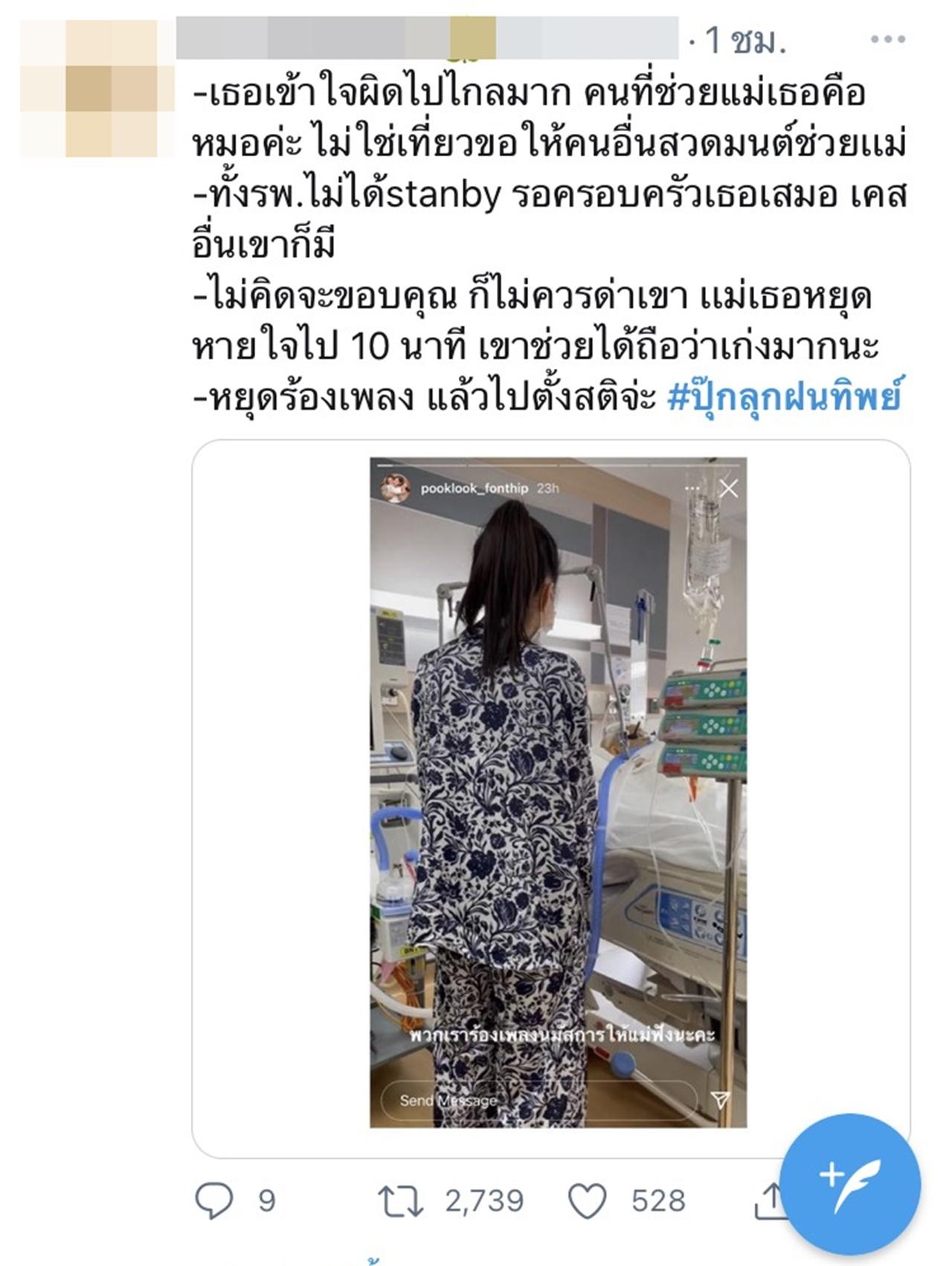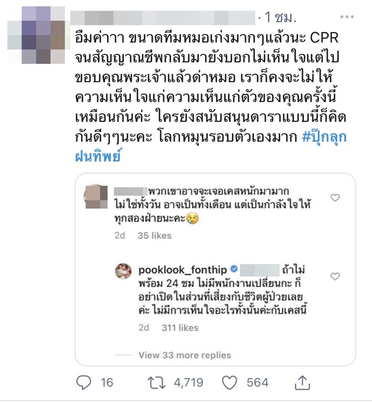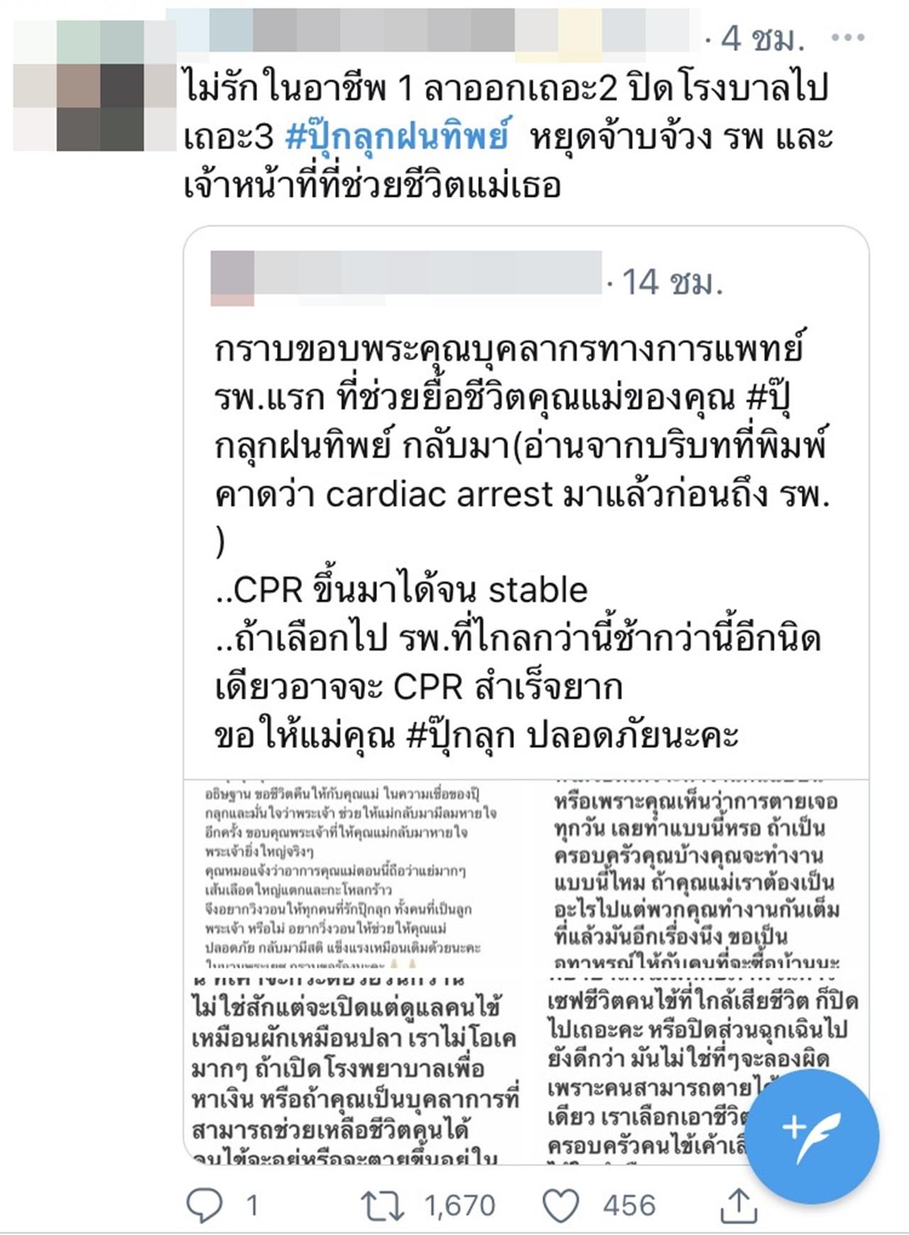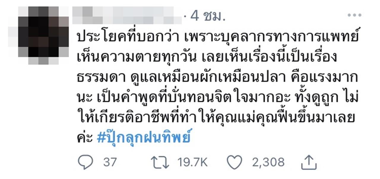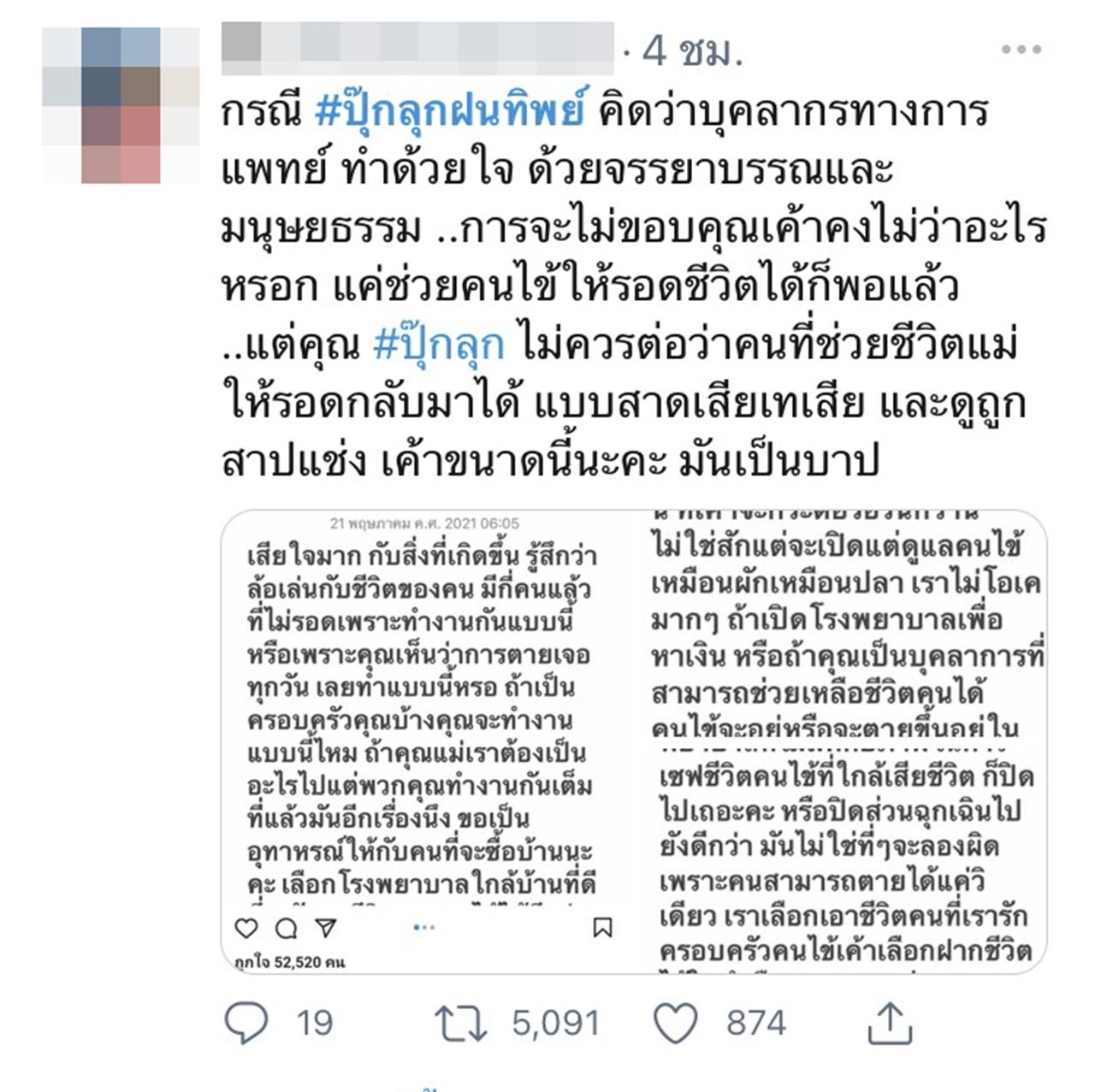 - กรณี #ปุ๊กลุกฝนทิพย์ คิดว่าบุคลากรทางการแพทย์ ทำด้วยใจ ด้วยจรรยาบรรณและมนุษยธรรม การจะไม่ขอบคุณเค้าคงไม่ว่าอะไรหรอก แค่ช่วยคนไข้ให้รอดชีวิตได้ก็พอแล้ว แต่คุณ #ปุ๊กลุก ไม่ควรต่อว่าคนที่ช่วยชีวิตแม่ให้รอดกลับมาได้ แบบสาดเสียเทเสีย และดูถูก สาปแช่ง เค้าขนาดนี้นะคะ มันเป็นบาป