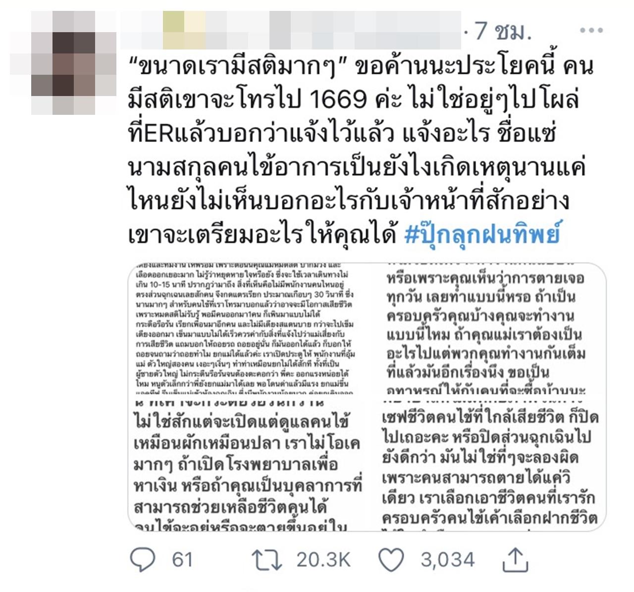 - "ขนาดเรามีสติมากๆ" ขอค้านนะประโยคนี้ คนมีสติเขาจะโทรไป 1669 ค่ะ ไม่ใช่อยู่ๆ ไปโผล่ที่ ER แล้วบอกว่าแจ้งไว้แล้ว แจ้งอะไร ชื่อแซ่นามสกุลคนไข้อาการเป็นยังไงเกิดเหตุนานแค่ไหนยังไม่เห็นบอกอะไรกับเจ้าหน้าที่สักอย่าง เขาจะเตรียมอะไรให้คุณได้ #ปุ๊กลุกฝนทิพย์