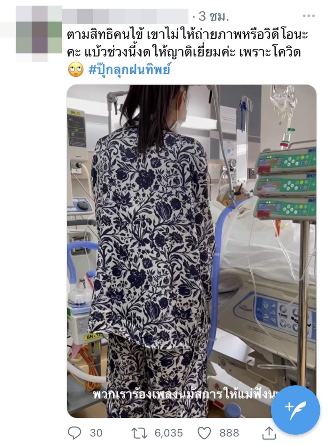 หลังจากที่ ปุ๊กลุก ฝนทิพย์ ได้โพสต์เล่าเรื่องราวของ คุณแม่ ที่เกิดอุบัติเหตุล้มหัวฟาดพื้น และมีเลือดออกจนต้องนำตัวส่งโรงพยาบาลเป็นการด่วน และในระหว่างที่ไปโรงพยาบาลคุณแม่ของนักแสดงสาวหยุดหายใจไปถึง 10 นาที แต่คุณหมอช่วยปั๊มหัวใจและฉีดยา คุณแม่กลับมาหายใจได้แต่ยังคงอยู่ในโคม่า