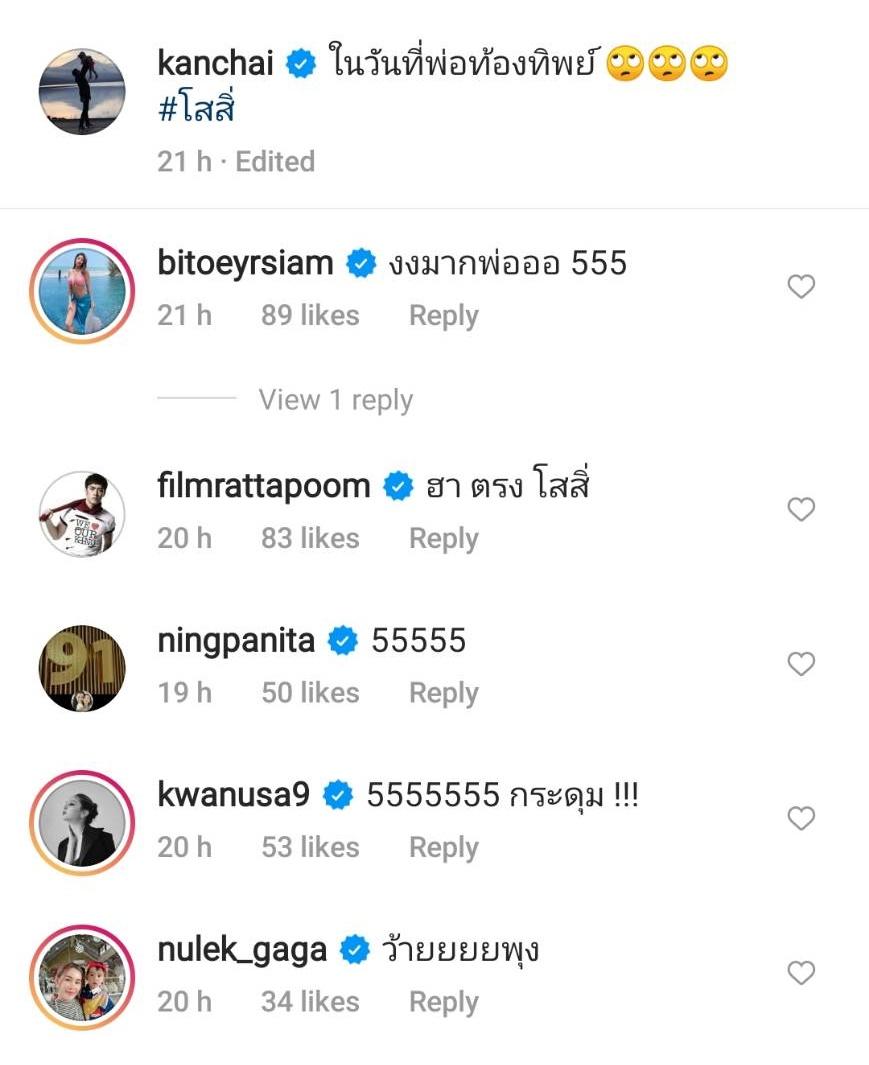 ด้านคนในวงการบันเทิงต่างแห่คอมเมนต์แซวเจ้าตัวเพียบ อาทิ ใบเตย อาร์สยาม “งงมากพ่อออ 555”, ฟิล์ม รัฐภูมิ “ฮา ตรง โสสิ่”, หนิง ปณิตา “55555”, ขวัญ อุษามณี “5555555 กระดุม !!!”, หนูเล็ก ก่อนบ่าย “ว้ายยยยพุง” แบงค์ อธิกิตติ์ “ใกล้คลอดแล้วนะครับเนี่ย ฝากโรงพยาบาลไหนครับ” ฯลฯ.