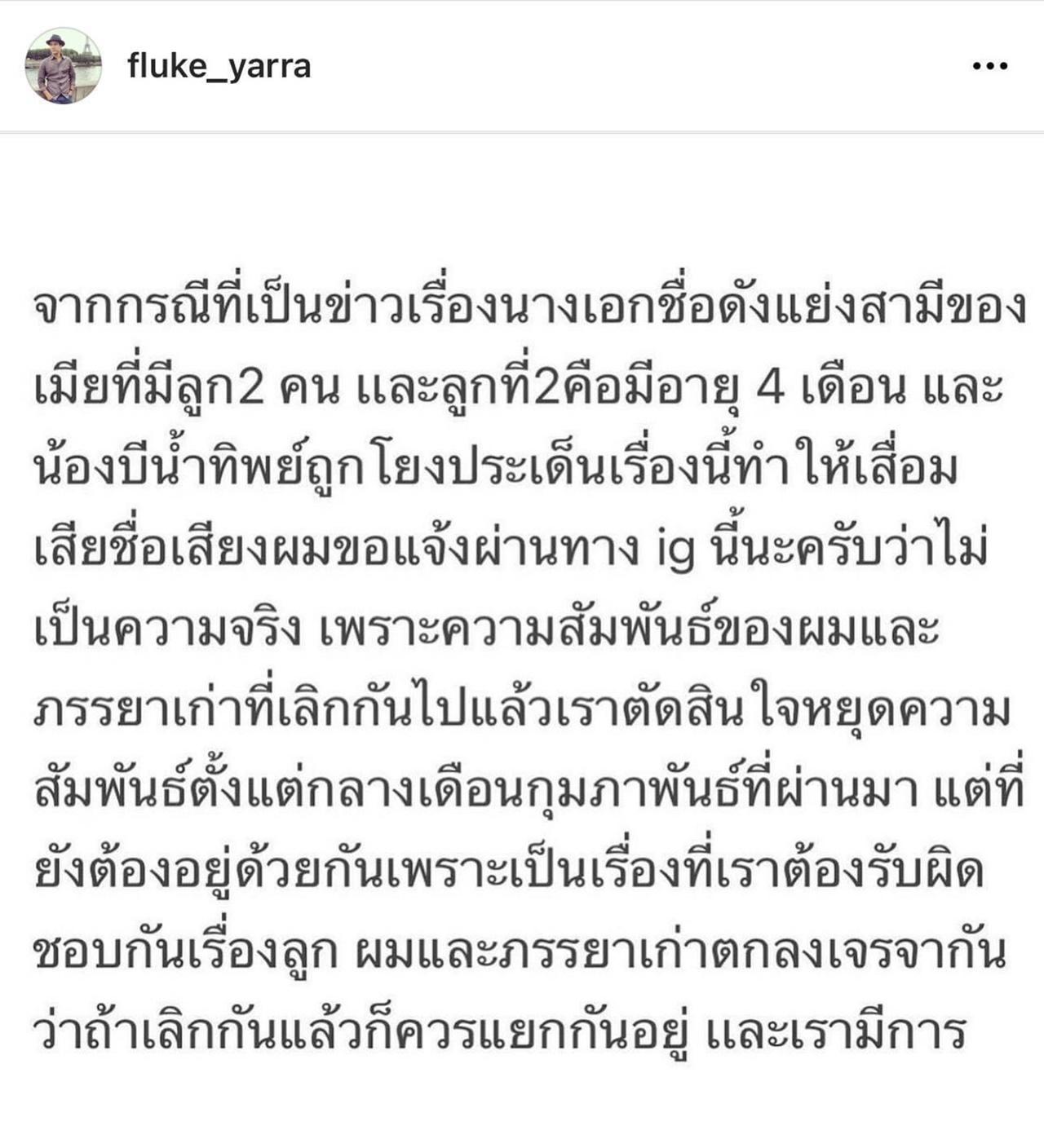 "จากกรณีที่เป็นข่าวเรื่องนางเอกชื่อดังแย่งสามีของเมียที่มีลูก 2 คน และลูกคนที่ 2 คือมีอายุ 4 เดือน และน้องบี น้ำทิพย์ ถูกโยงประเด็นเรื่องนี้ทำให้เสื่อมเสียชื่อเสียง ผมขอแจ้งผ่านทาง ig นี้นะครับว่าไม่เป็นความจริง