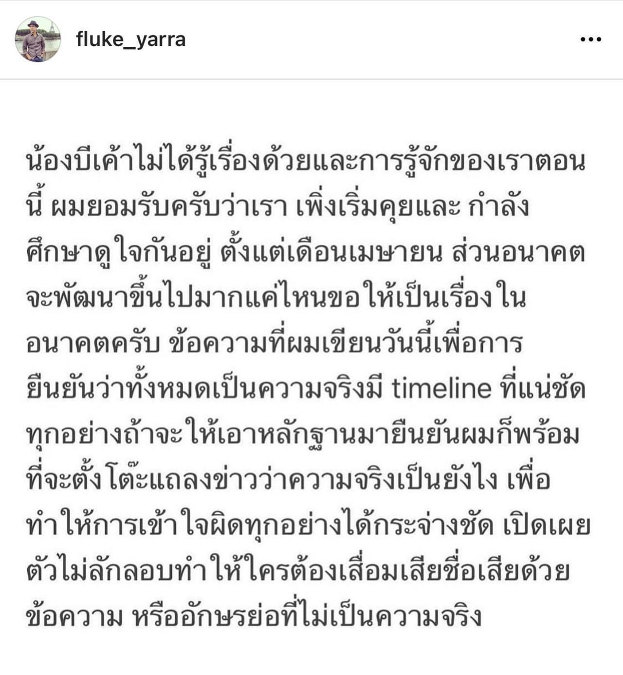 ก่อนที่จะมีข่าวลือออกไปต่างนานา ฝ่ายชายก็ได้ออกมาชี้แจงถึงเรื่องดังกล่าวผ่านอินสตาแกรมส่วนตัว พร้อมกับเขียนแคปชั่นว่า "tell the truth" โดย ฟลุค ได้บอกว่า ตนเองนั้นเลิกกับภรรยาเก่ามาตั้งแต่เดือน ก.พ. แล้ว และเพิ่งเริ่มคุยกับ บี หลังจากเลิกกับภรรยาเด็ดขาดแล้ว การที่มากล่าวหาว่าฉกสามีชาวบ้านจึงไม่เป็นความจริง