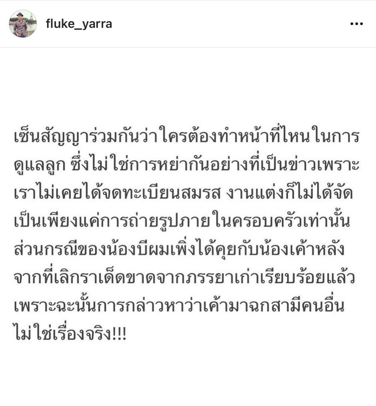 และเรามีการเซ็นสัญญาร่วมกันว่าใครต้องทำหน้าที่ไหนในการดูแลลูก ซึ่งไม่ใช่การหย่ากันอย่างที่เป็นข่าวเพราะเราไม่เคยจดทะเบียนสมรส งานแต่งก็ไม่ได้จัดเป็นเพียงแค่การถ่ายรูปภายในครอบครัวเท่านั้น