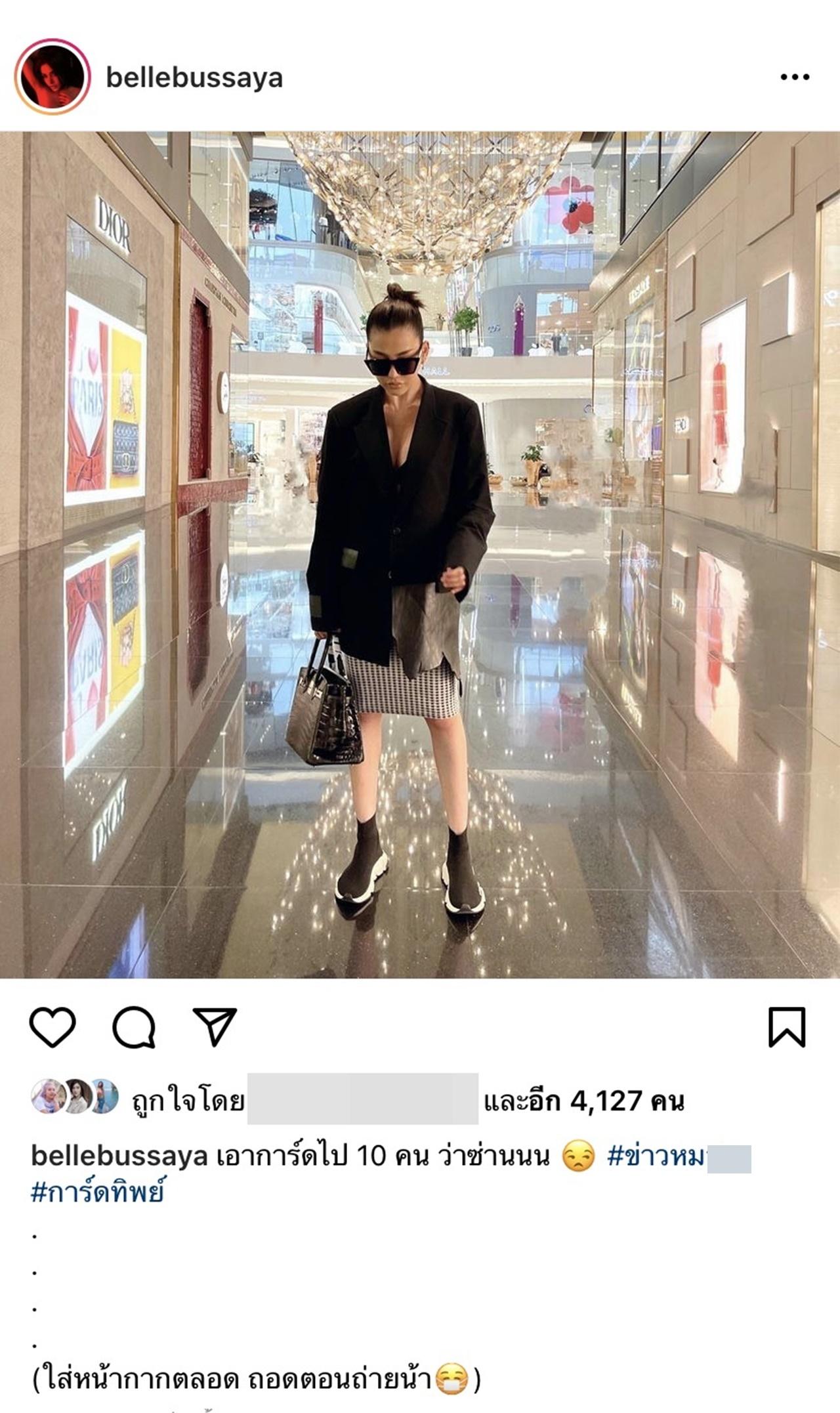 ในวันเดียวกับที่เพจได้โพตส์ข้อความดังกล่าวไป ทางด้าน เบล บุษยา ก็ได้โพสต์รูปตัวเองลงในอินสตาแกรมพร้อมแคปชั่นสุดแซ่บที่อ่านแล้วมีสะดุ้งว่า “หน้าหลักร้อยเรียกหลักล้าน #ว่าซ่านนนน #พบคนร้อนเงิน1อัตรา” และ “เอาการ์ดไป 10 คน ว่าซ่านนน #ข่าวหม_ย #การ์ดทิพย์”.