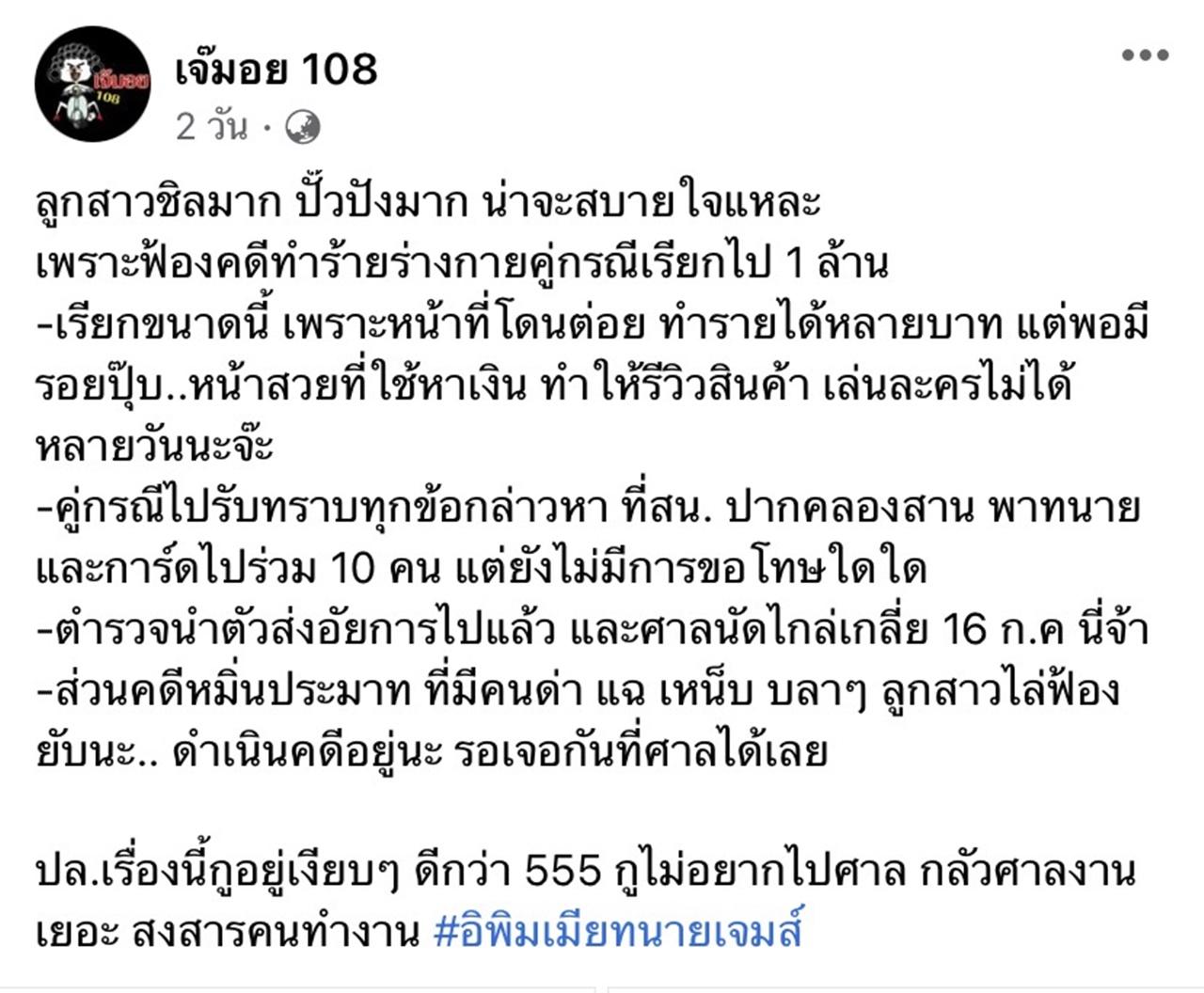 หลังจากที่เพจดัง เจ๊มอย 108 ได้เขียนถึงกรณีของ ดิว อริสรา ทองบริสุทธิ์ ที่ฟ้อง เบล บุษยา ตั้งภากรณ์ ลูกสาว บรรยิน ตั้งภากรณ์ ในข้อหาหมิ่นประมาท รวมไปถึงฟ้องสาวหล่อแฟนของ เบล บุษยา ในข้อหาทำร้ายร่างกาย หลังจากที่ทั้งคู่มีปัญหากันบนเรือในงานวันเกิดของเพื่อน