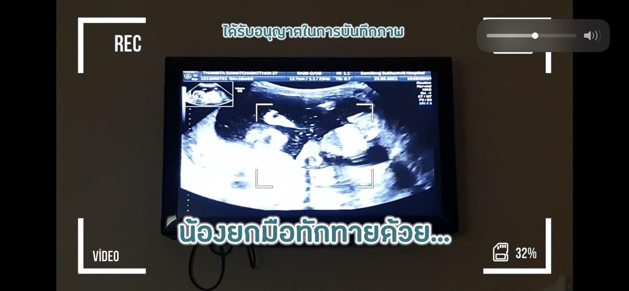 ชมพู่ : ตอนนั้นถ้าย้อนไป 7 เดือนที่แล้ว หนูบ้าออกกำลังกายมาก น้ำหนักหนูลงไปถึง 45 กิโล คือมันเฟิร์ม มันเพรียว จนไม่ได้สังเกตตัวเองว่าท้อง แล้วหลังให้นม ประจำเดือนมันจะมาบ้าง ไม่มาบ้าง แล้วมันจะมาน้อยจนเราไม่ได้สังเกต จนมาวันนึงสังเกต ก็เลยตรวจดีกว่า ก็ขึ้น 2 ขีด ก็นั่งคุยกับคุณบอยว่าวันไหนนะที่เราเผลอตัว เผลอใจ เราก็กะวันแล้วนั่งนับๆ ดู เดี๋ยว 8 สัปดาห์ คือ 2 เดือนค่อยไปพบแพทย์ แต่หมอบอกว่าไม่ใช่แล้วคุณชมพู่ คือตัวใหญ่ เห็นอวัยวะเพศแล้ว นี่คือ 14 สัปดาห์แล้ว คือเข้าเดือนที่ 4 คือตอนที่หนูรู้คือ 4 เดือนแล้ว