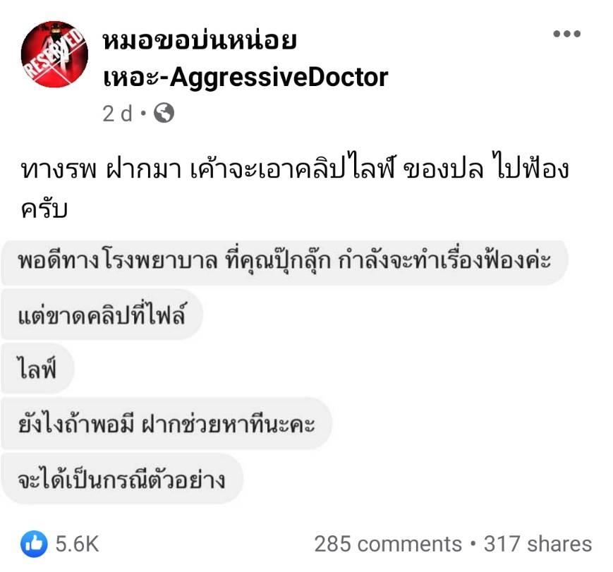 ล่าสุด เพจดัง “หมอขอบ่นหน่อยเหอะ-AggressiveDoctor” ได้มีการโพสต์ภาพแชตที่อ้างว่ามีข้อความ “พอดีทางโรงพยาบาลที่คุณปุ๊กลุก กำลังจะทำเรื่องฟ้องค่ะ แต่ขาดคลิปที่ไลฟ์ ยังไงถ้าพอมี ฝากช่วยหาทีนะคะ จะได้เป็นกรณีตัวอย่าง” พร้อมทั้งเขียนแคปชั่น "ทาง รพ. ฝากมา เค้าจะเอาคลิปไลฟ์ ของปล ไปฟ้องครับ"