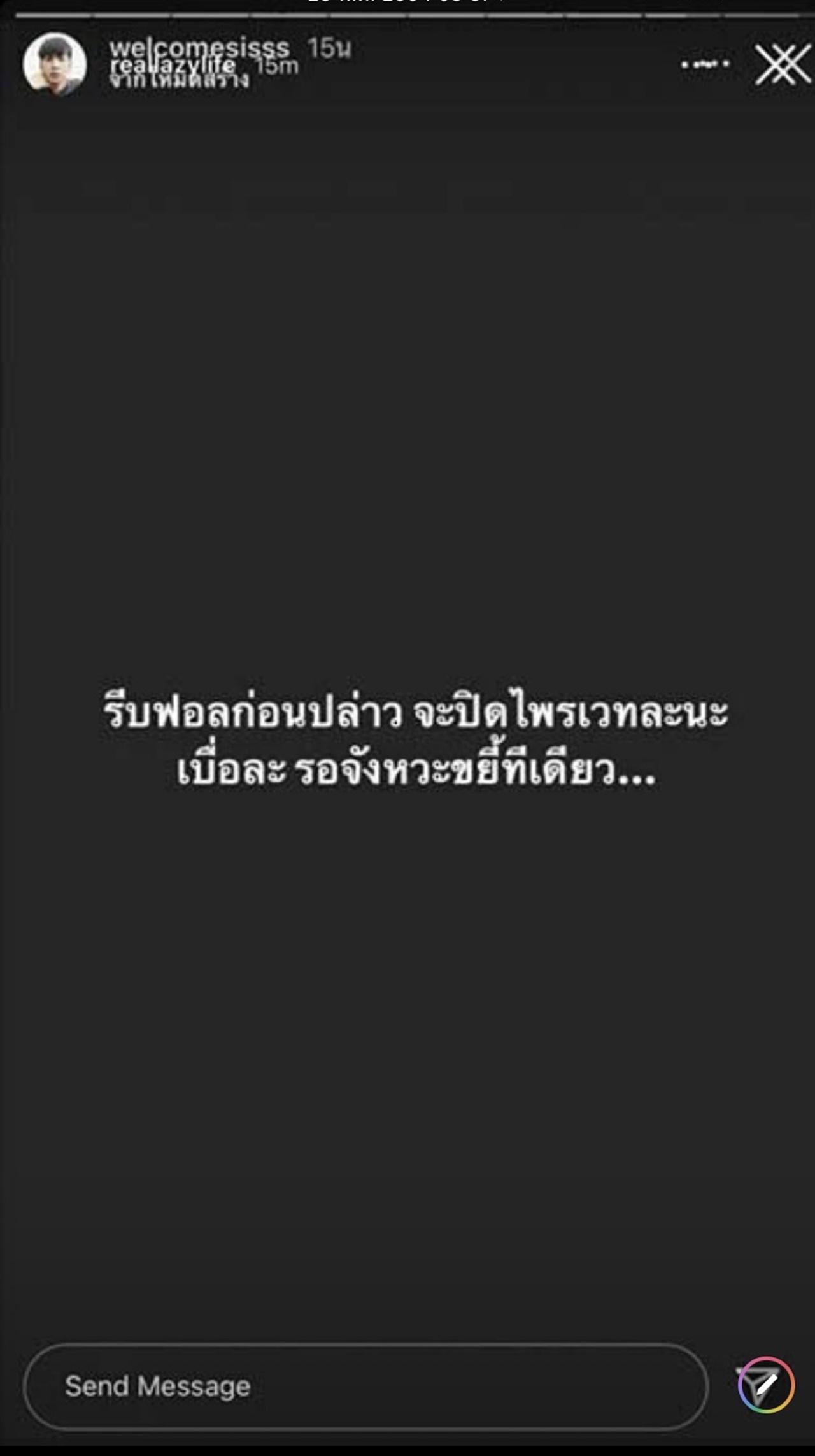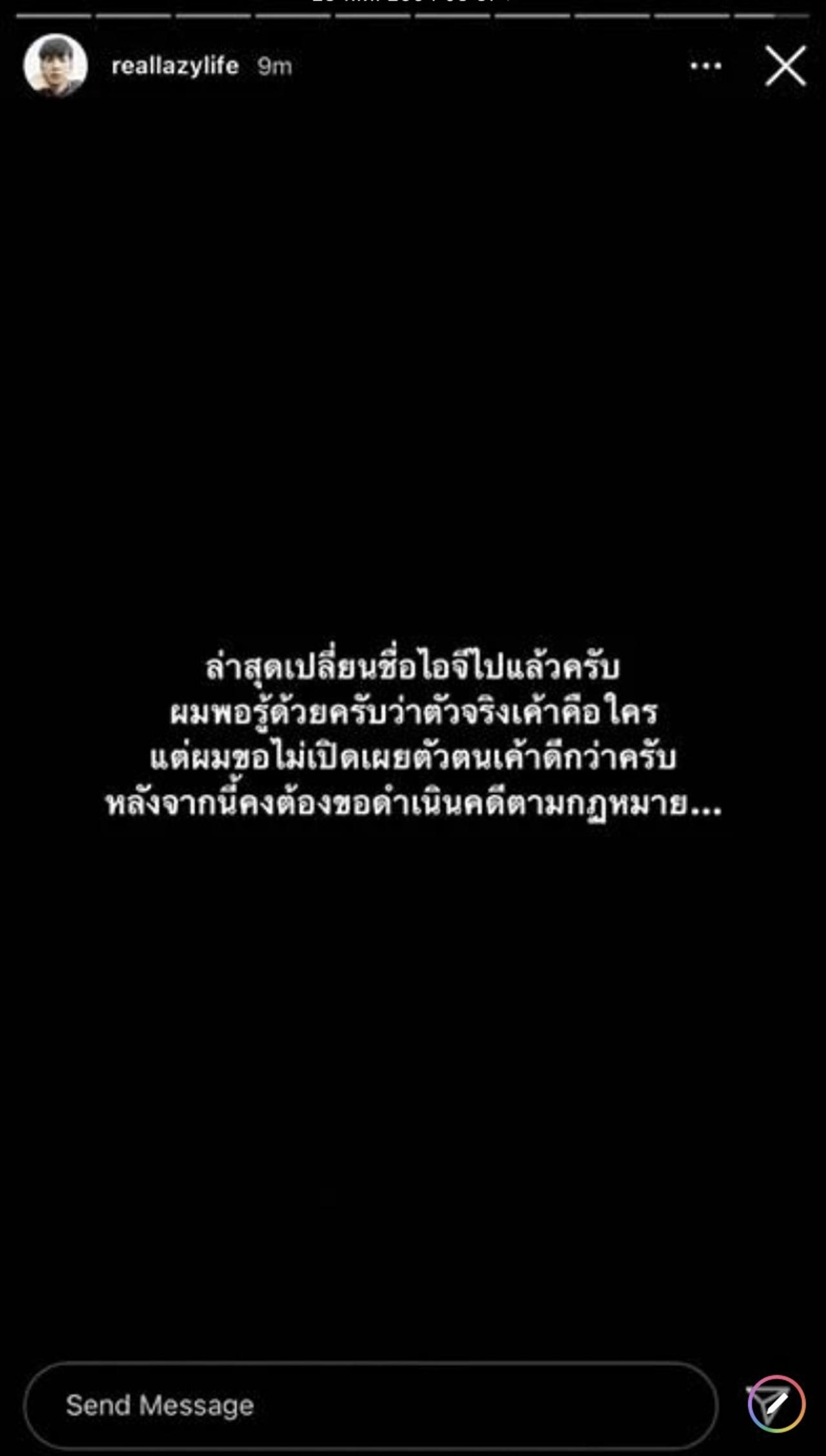 จากนั้น ท็อป Lazyloxy ก็ได้โพสต์ไอจีสตอรี่และเขียนข้อความว่า "ล่าสุดเปลี่ยนชื่อไอจีไปแล้วครับ ผมพอรู้ด้วยครับว่าตัวจริงเค้าคือใคร แต่ผมขอไม่เปิดเผยตัวตนเค้าดีกว่าครับ หลังจากนี้คงต้องขอดำเนินคดีตามกฎหมาย"