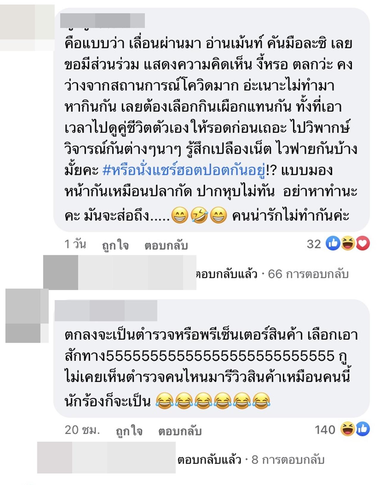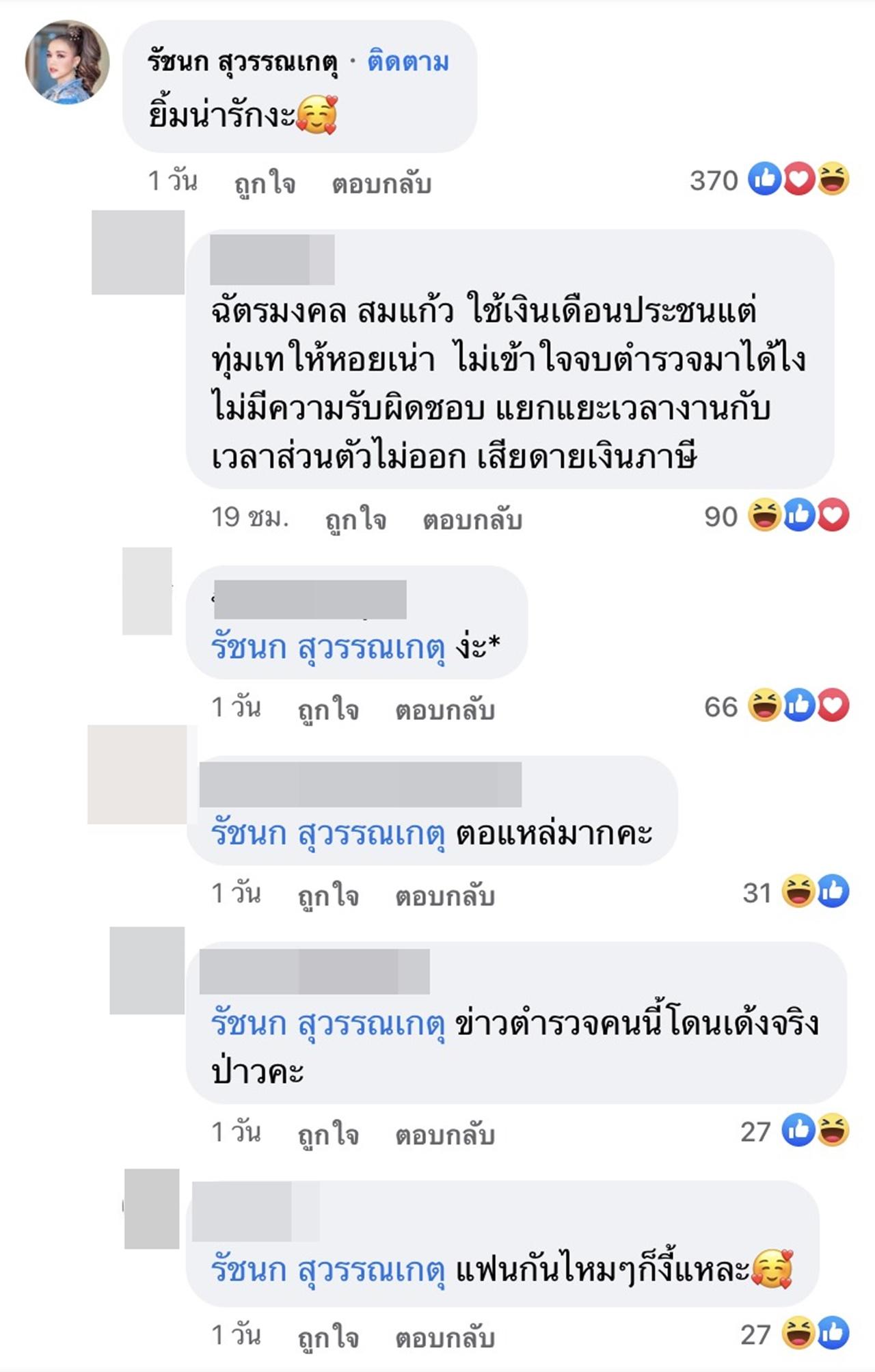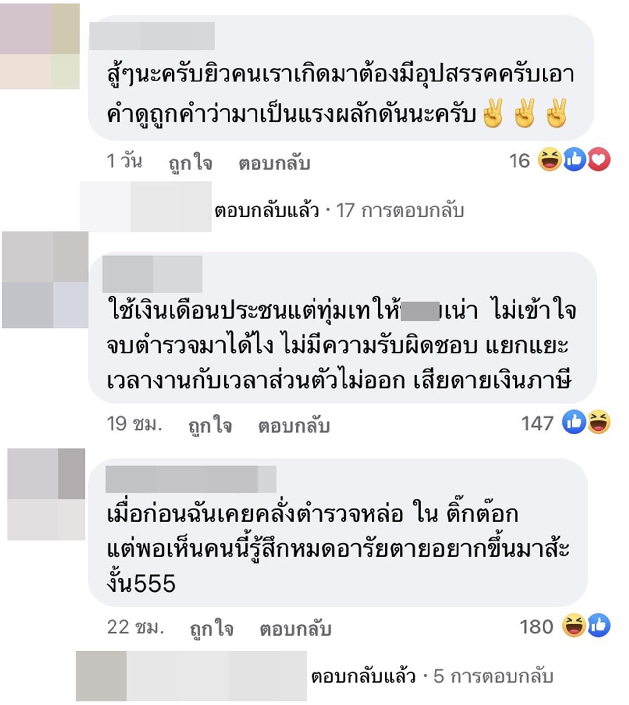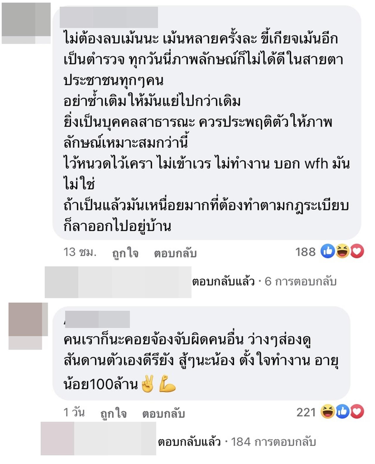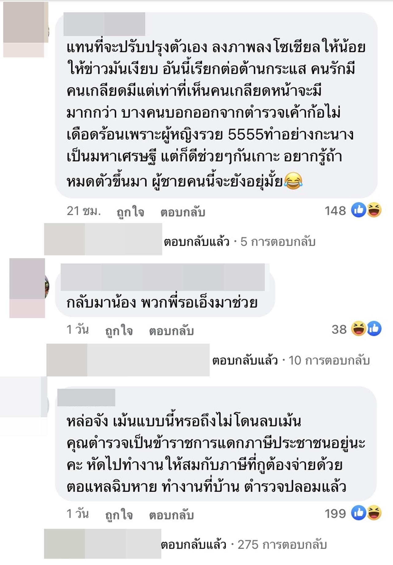 ส่วนชาวเน็ตก็เข้ามาคอมเมนต์แสดงความคิดเห็นใต้รูปมากมาย มีทั้งส่งกำลังใจให้นายตำรวจหนุ่ม และตำหนิพฤติกรรมของ ยิว ฉัตรมงคล มากมายอีกด้วย