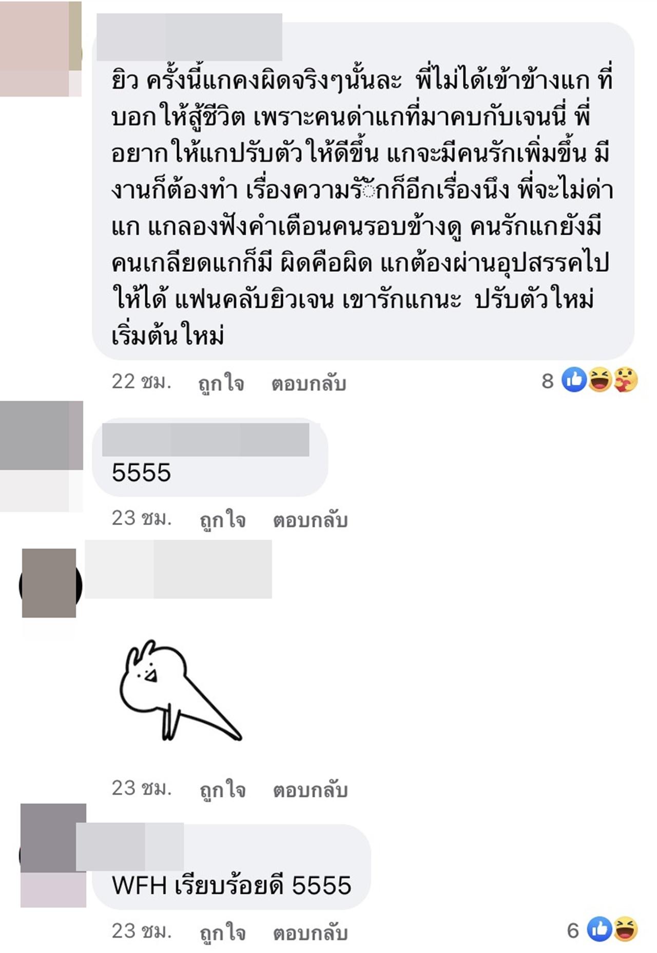 หลังจากที่ ยิว ฉัตรมงคล สมแก้ว โพสต์รูปและแคปชั่นดังกล่าวไป แฟนสาว เจนนี่ ได้หมดถ้าสดชื่น ก็ได้เข้ามาคอมเมนต์ว่า "ยิ้มน่ารักงะ"