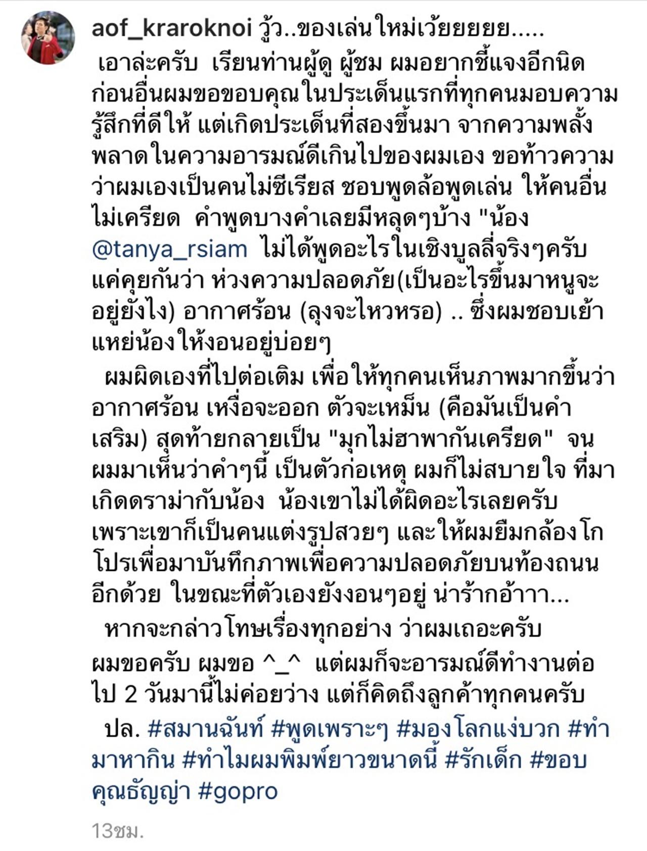 ขอท้าวความว่าผมเองเป็นคนไม่ซีเรียส ชอบพูดล้อพูดเล่น ให้คนอื่นไม่เครียด คำพูดบางคำเลยมีหลุดๆบ้าง "น้อง @tanya_rsiam ไม่ได้พูดอะไรในเชิงบูลลี่จริงๆครับ แค่คุยกันว่า ห่วงความปลอดภัย(เป็นอะไรขึ้นมาหนูจะอยู่ยังไง) อากาศร้อน (ลุงจะไหวหรอ) .. ซึ่งผมชอบเย้าแหย่น้องให้งอนอยู่บ่อยๆ