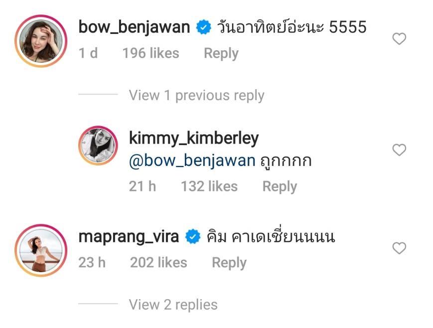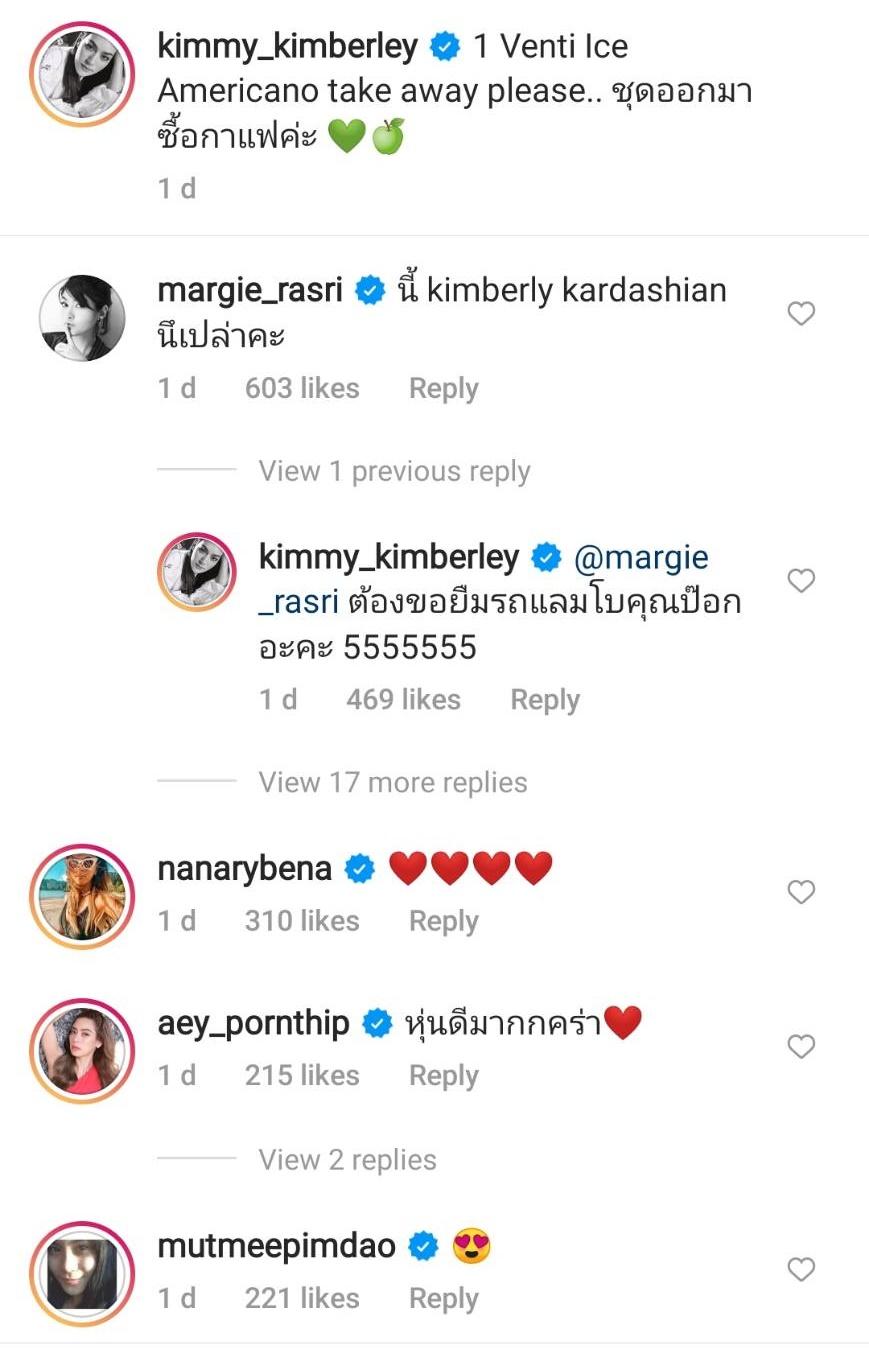 งานนี้นอกจากแฟนๆ จะแห่กดไลค์และคอมเมนต์กันรัวๆ แล้ว คนในวงการบันเทิงต่างเข้ามาคอมเมนต์แซวหลายคน รวมไปถึงเพื่อนซี้อย่างนางเอกสาว มาร์กี้ ราศรี ที่แอบแซวเพื่อนตัวเองว่าเป็น คิม คาร์เดเชียน รึเปล่า โดยบอกว่า “นี้ kimberly kardashian รึเปล่าคะ” ก่อนที่คิมเบอร์ลี่จะตอบกลับว่า “ต้องขอยืมรถแลมโบคุณป๊อกอะคะ 5555555”.