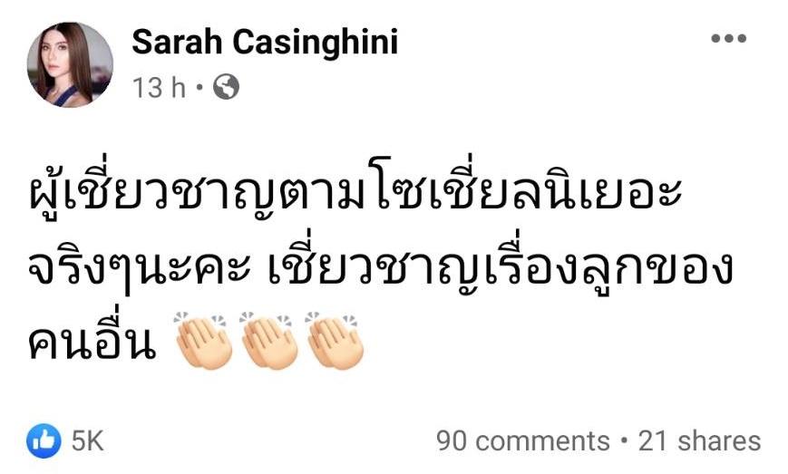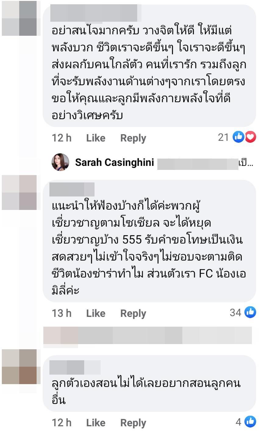 ซึ่งหลังจากนั้น ซาร่าก็โพสต์ข้อความระบายในเฟซบุ๊ก ถึงเรื่องที่มีชาวเน็ตชอบมาวิจารณ์เรื่องการเลี้ยงลูกของเธอว่า “ผู้เชี่ยวชาญตามโซเชี่ยลนิเยอะจริงๆ นะคะ เชี่ยวชาญเรื่องลูกของคนอื่น” จากนั้นก็มีคอมเมนต์จากแฟนๆ ที่บอกว่าอย่าไปใส่ใจ คิดบวกเพื่อให้ชีวิตและจิตใจดีขึ้น แต่ก็มีคนที่แนะนำว่าให้ฟ้องพวกผู้เชี่ยวชาญตามโซเชียล จะได้หยุดเชี่ยวชาญบ้าง รับคำขอโทษเป็นเงินสดสวยๆ พร้อมทั้งบอกว่าไม่เข้าใจถ้าไม่ชอบจะตามติดทำไม ฯลฯ