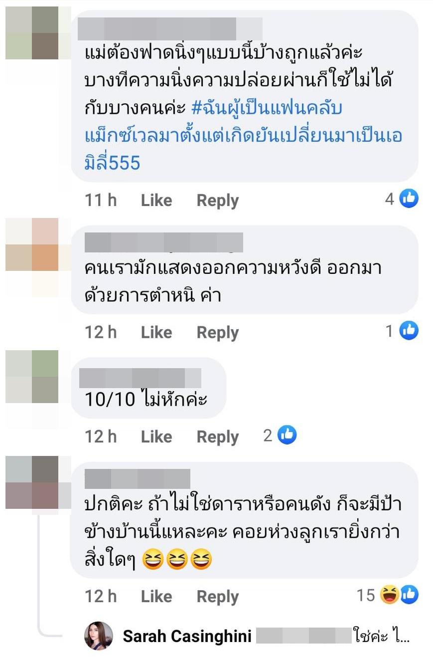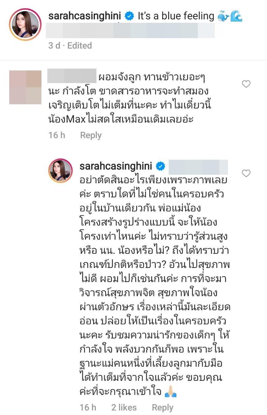 แต่แล้วก็มีชาวเน็ตรายหนึ่งเข้ามาวิจารณ์ว่า “ผอมจังลูก ทานข้าวเยอะๆ นะ กำลังโต ขาดสารอาหารจะทำสมองเจริญเติบโตไม่เต็มที่นะคะ ทำไมเดี๋ยวนี้น้อง Max ไม่สดใสเหมือนเดิมเลยอ่ะ” ก่อนที่ซาร่าจะตอบกลับยาวๆ ว่า “อย่าตัดสินอะไรเพียงเพราะภาพเลยค่ะ ตราบใดที่ไม่ใช่คนในครอบครัว อยู่ในบ้านเดียวกัน พ่อแม่น้อง โครงสร้างรูปร่างแบบนี้ จะให้น้องโครงเท่าไหนค่ะ ไม่ทราบว่ารู้ส่วนสูง หรือ นน. น้องหรือไม่? ถึงได้ทราบว่าเกณฑ์ปกติหรือป่าว?