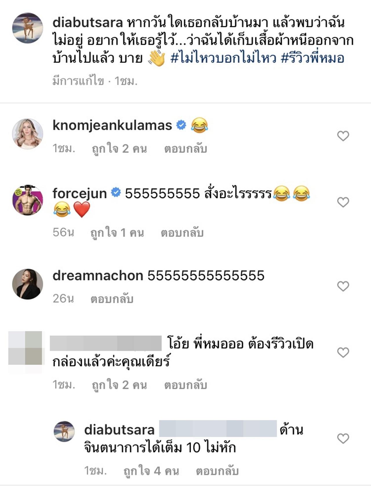 ซึ่ง เดียร์ ก็ได้เขียนแคปชั่นว่า "หากวันใดเธอกลับบ้านมา แล้วพบว่าฉันไม่อยู่ อยากให้เธอรู้ไว้...ว่าฉันได้เก็บเสื้อผ้าหนีออกจากบ้านไปแล้ว บาย #ไม่ไหวบอกไม่ไหว #รีวิวพี่หมอ" งานนี้ทำเอาหลายคนที่ติดตามอดขำไม่ไหว ต่างหัวเราะกับการรีวิวแฟนของ เดียร์ กันเป็นจำนวนมาก พร้อมกับบอกว่า สงสัยช่วงนี้คุณหมอคงทำงานจริงๆ.
