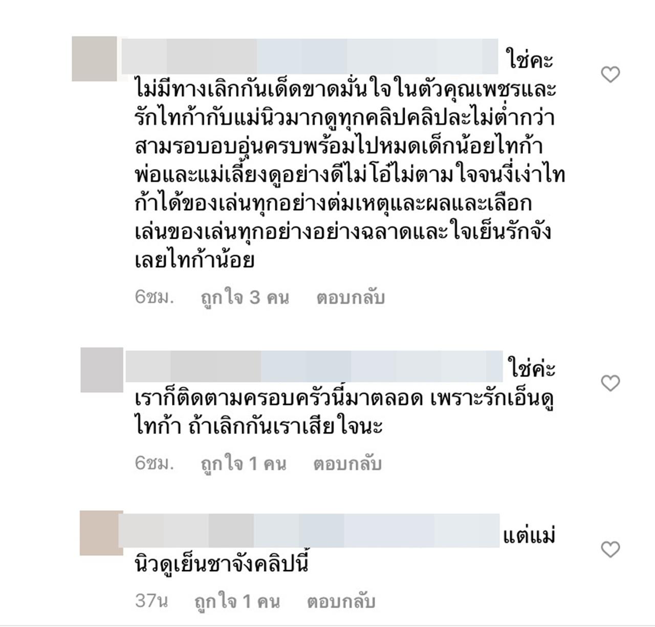 และ "ใช่ค่ะไม่มีทางเลิกกันเด็ดขาดมั่นใจในตัวคุณเพชรและรักไทก้ากับแม่นิวมากดูทุกคลิป คลิปละไม่ต่ำกว่าสามรอบ