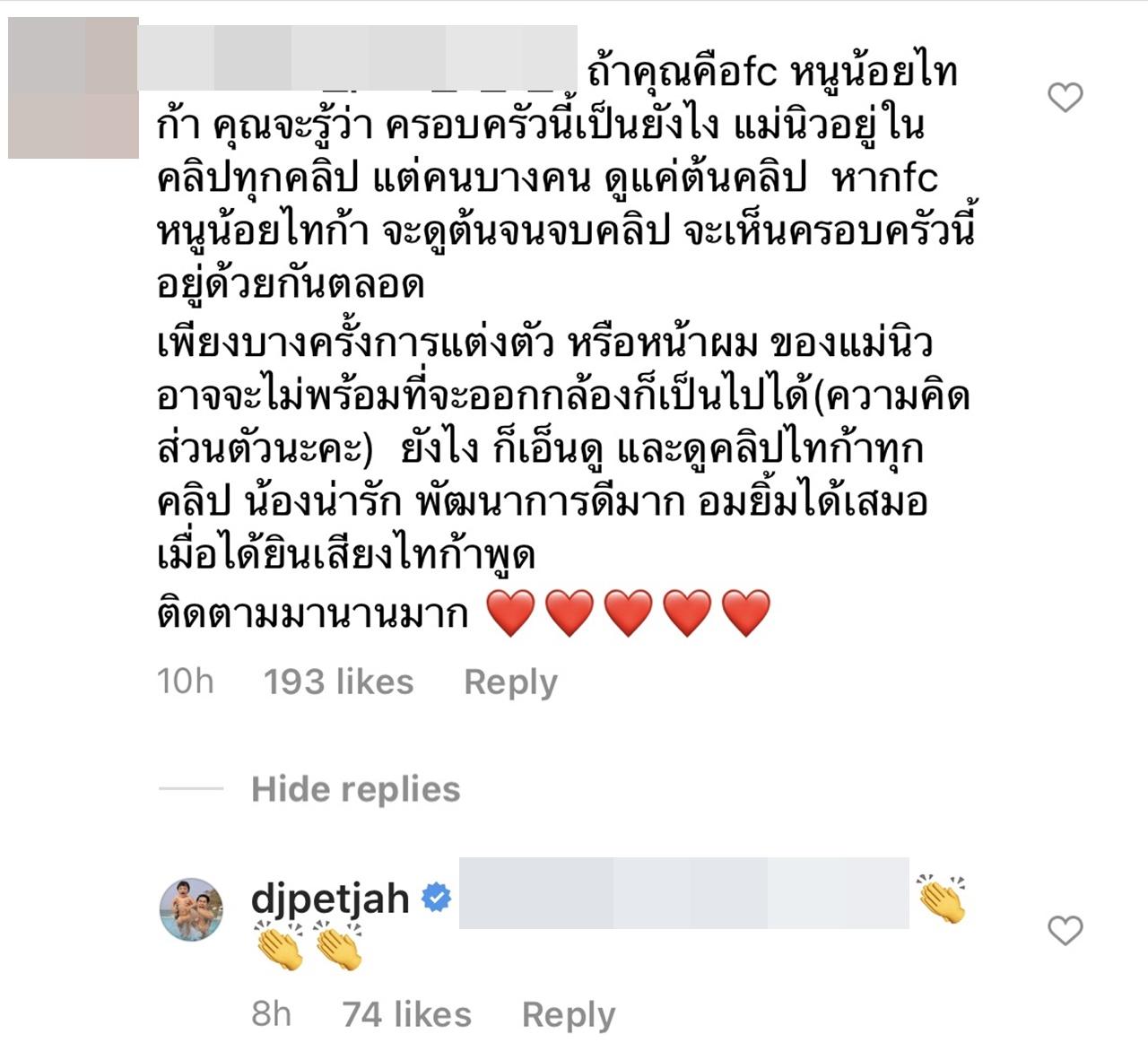 น้องน่ารัก พัฒนาการดีมาก อมยิ้มได้เสมอเมื่อได้ยินเสียงไทก้าพูด ติดตามมานานมาก" งานนี้ ดีเจเพชรจ้า ก็ได้ตอบกลับคอมเมนต์นี้ด้วยรูปอีโมจิปรบมือ
