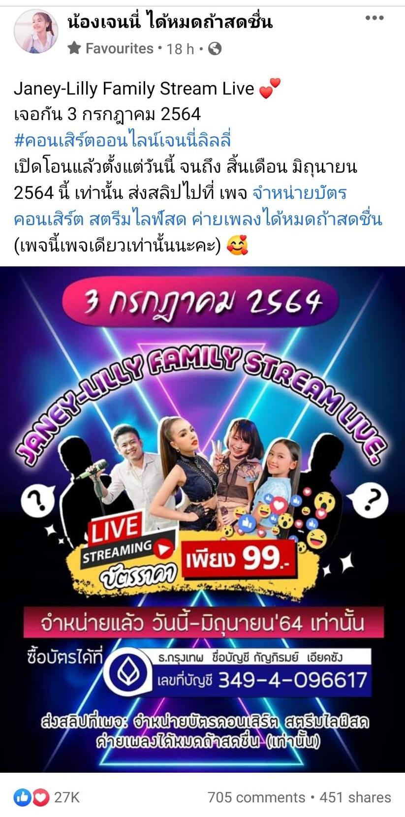ล่าสุด เจนนี่ ได้หมดถ้าสดชื่น โพสต์ภาพและข้อความประกาศเปิดขายบัตรคอนเสิร์ตออนไลน์ในชื่อ “Janey-Lilly Family Stream Live” ซึ่งจะจัดขึ้นในวันที่ 3 ก.ค. 2564 พร้อมทั้งแจ้งเลขบัญชีโอนเงิน ซึ่งไม่ใช่ชื่อบัญชีบริษัท และให้ส่งสลิปการโอนเงินที่เพจจำหน่ายบัตรคอนเสิร์ต