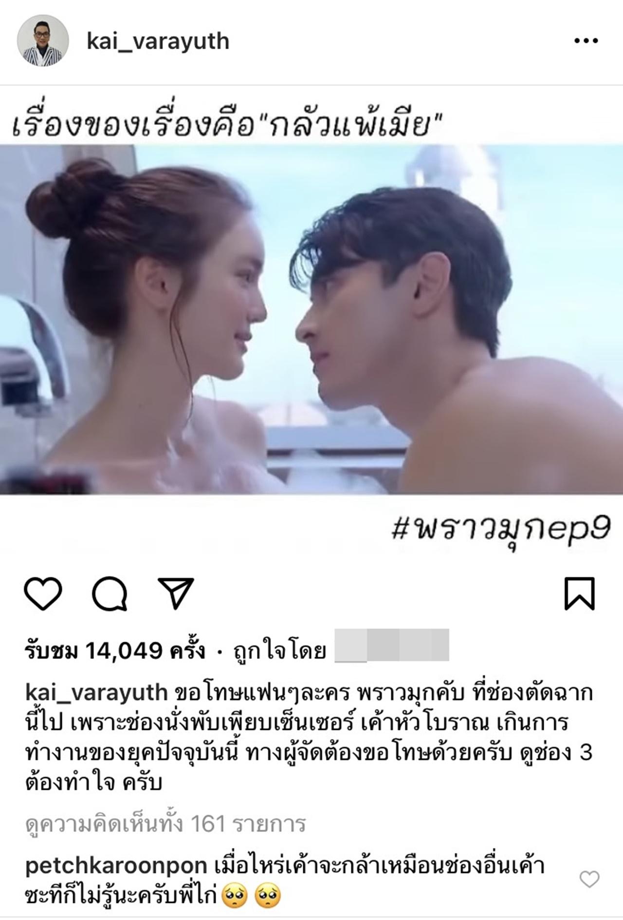 โดย ไก่ ได้โพสต์คลิปฉากที่ถูกตัดออก พร้อมเขียนข้อความผ่านอินสตาแกรม ขอโทษแฟนละคร พร้อมกับบอกว่าโดนทางช่องเซนเซอร์เพียบ เขาหัวโบราณเกินการทำงานในยุคนี้