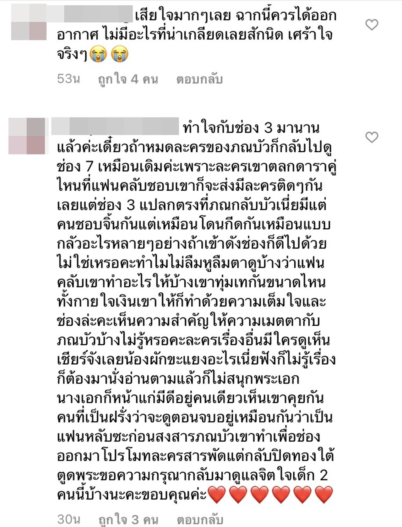 "ช่องสามทำร้ายจิตใจคนรอขนาดไหน แย่มากค่ะ เรื่องอื่นไม่เห็นเป็น เป็นเเต่เฉพาะคู่ภณบัวหรือเปล่า เหมือนไม่อยากให้เรตติ้งดี ฉากหวานนับเป็นวินาที ใจร้ายมากค่ะ แย่มาก ผิดหวังที่สุดกับช่องสาม จะเรียกให้คนดูสดหรือจะทำร้ายคนดู", "หนูไม่ได้ดูไม่เสียใจเท่ากับความตั้งใจของทีมงานและนักแสดงเลยค่ะ"