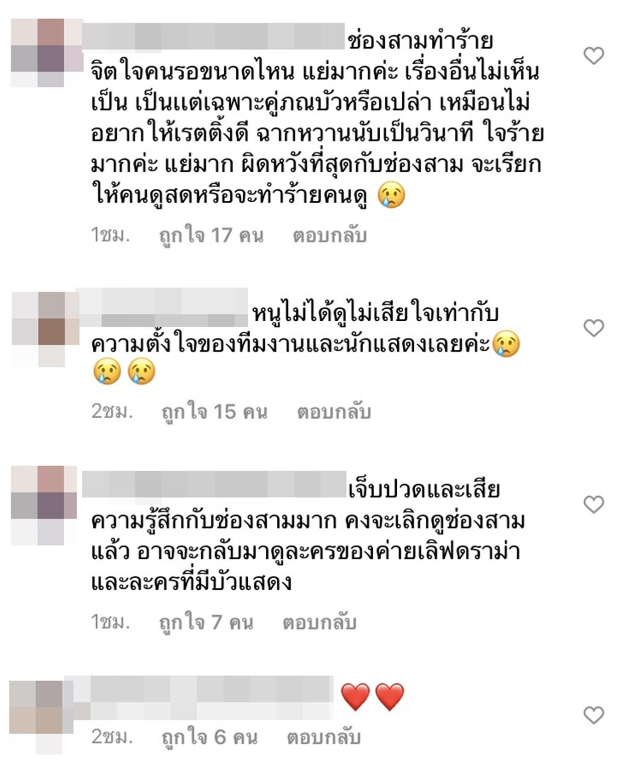 "เจ็บปวดและเสียความรู้สึกกับช่องสามมาก คงจะเลิกดูช่องสามแล้ว อาจจะกลับมาดูละครของค่ายเลิฟดราม่า และละครที่มีบัวแสดง".