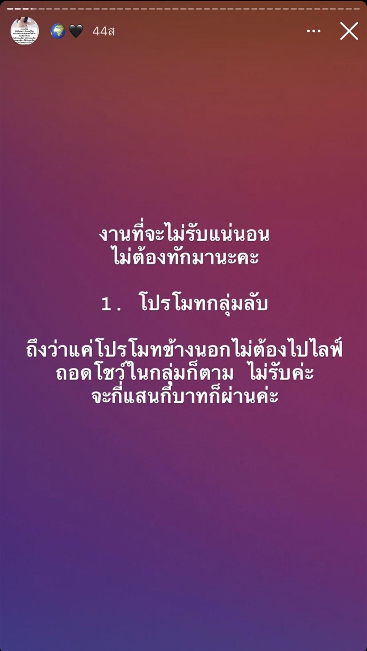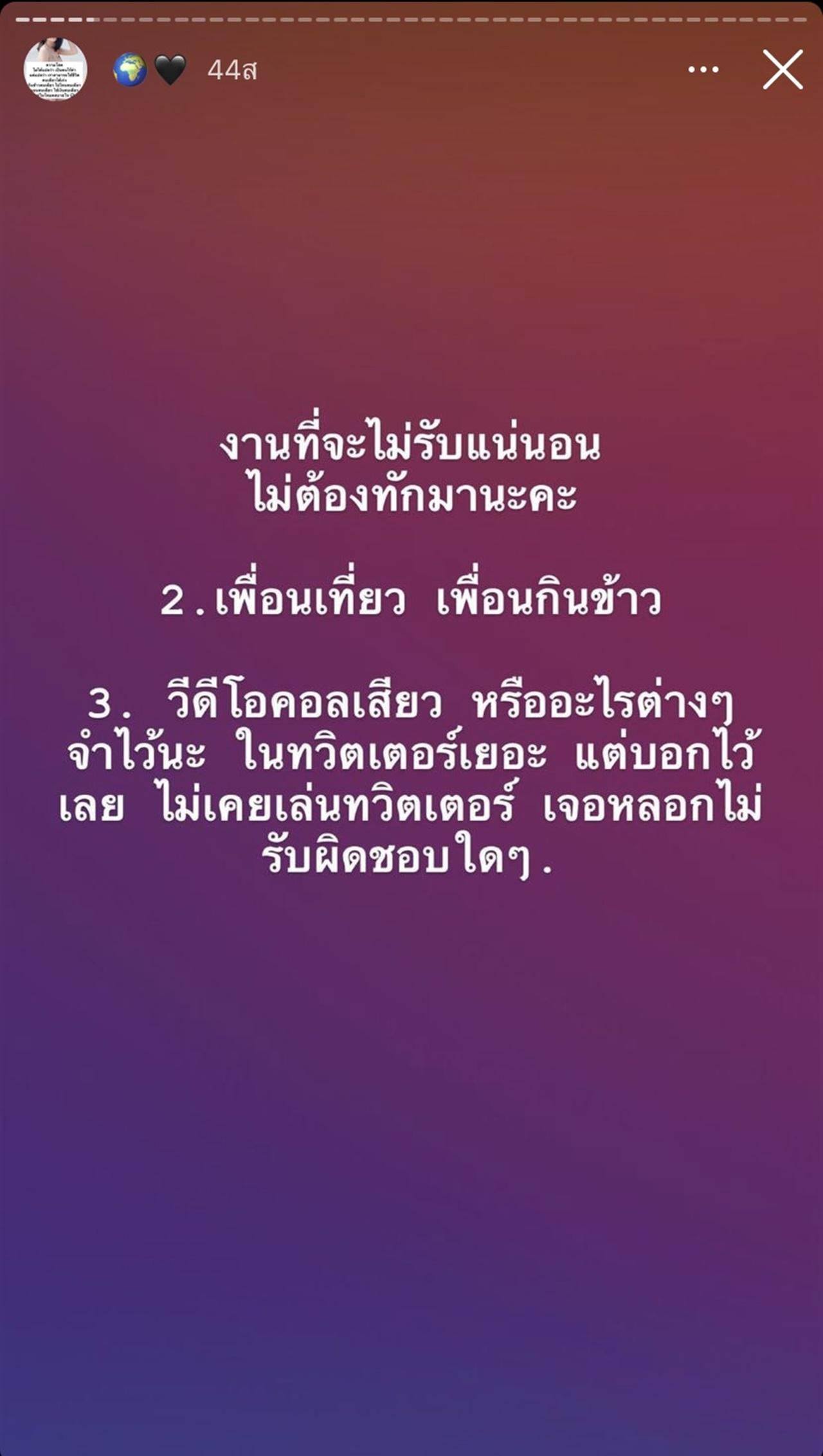 "งานที่จะไม่รับแน่นอน ไม่ต้องทักมานะคะ 1. โปรโมตกลุ่มลับ ถึงว่าแค่โปรโมตข้างนอกไม่ต้องไปไลฟ์ถอดโชว์ในกลุ่มก็ตาม ไม่รับค่ะ จะกี่แสนกี่บาทก็ผ่านค่ะ 2. เพื่อนเที่ยว เพื่อนกินข้าว 3. วิดีโอคอลเสียว หรืออะไรต่างๆ จำไว้นะ ในทวิตเตอร์เยอะ แต่บอกไว้เลยไม่เคยเล่นทวิตเตอร์ เจอหลอกไม่รับผิดชอบใดๆ"